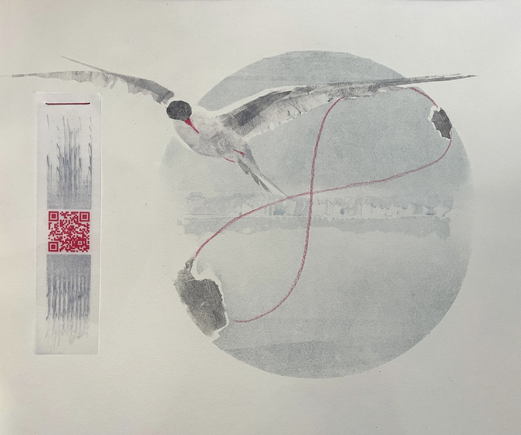 Arctic Tern is a monotype created with multiple intricate stencils. It is a 1/1, therefore monotype. It has an accompanying QR code. The QR code, when scanned, will direct the viewer to the sound of the bird.