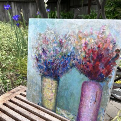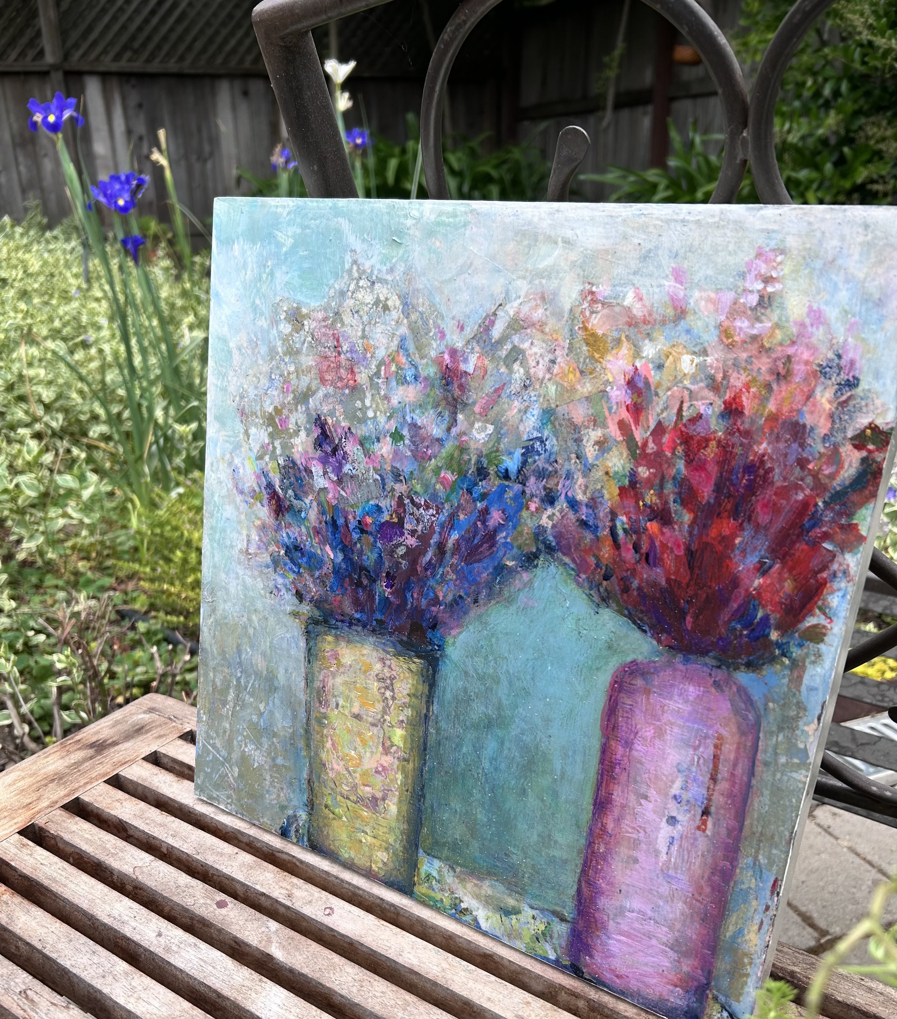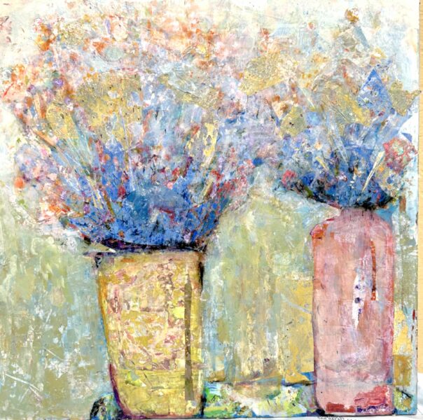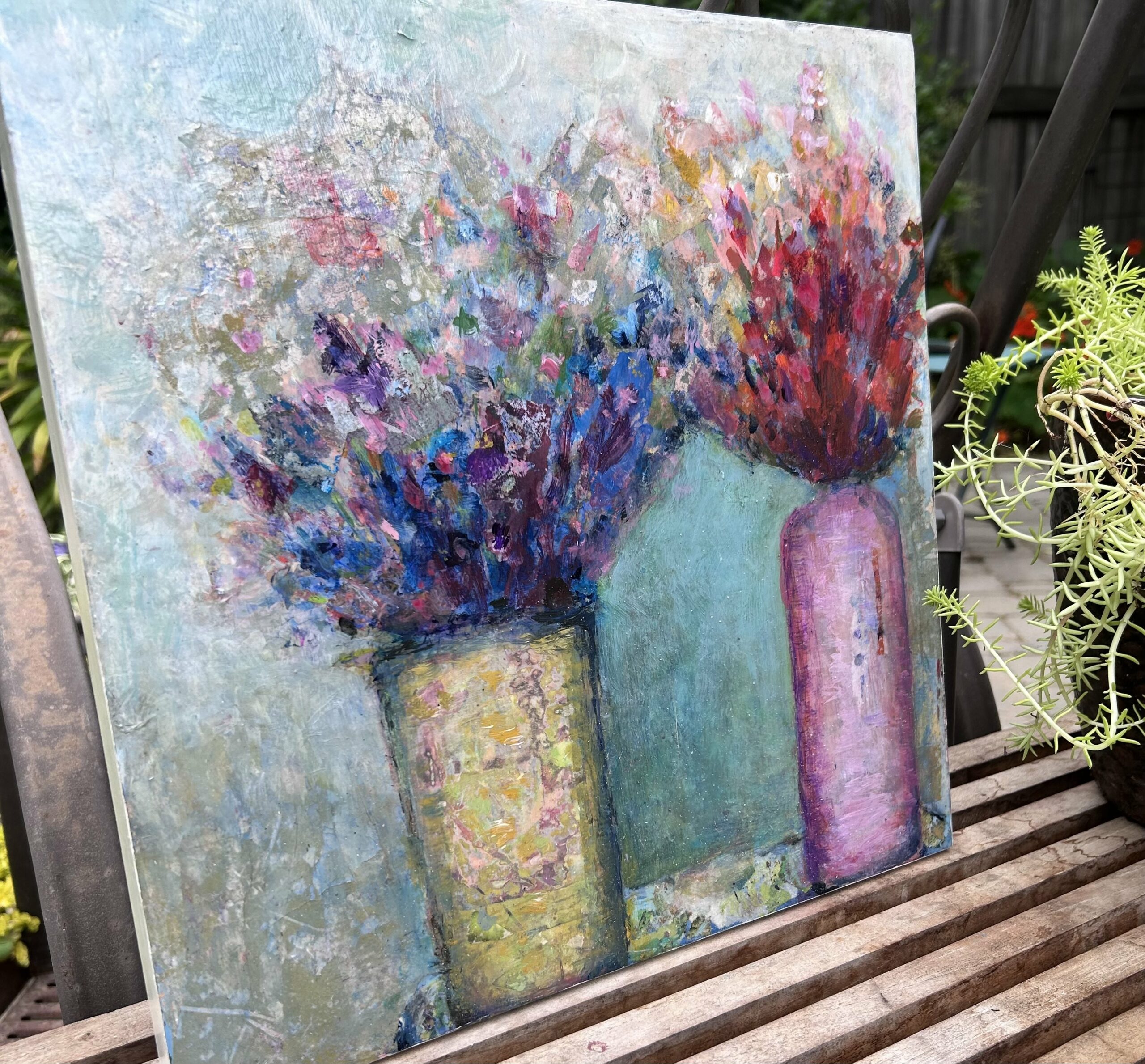 This painting includes a medley of blues, purples, pinks and oranges. The background is a mix of muted greens, yellows, and creams, creating a soft, blended backdrop that allows the flowers to stand out. It has collage elements, especially visible in the body of the vases. It’s a piece that evokes joy.