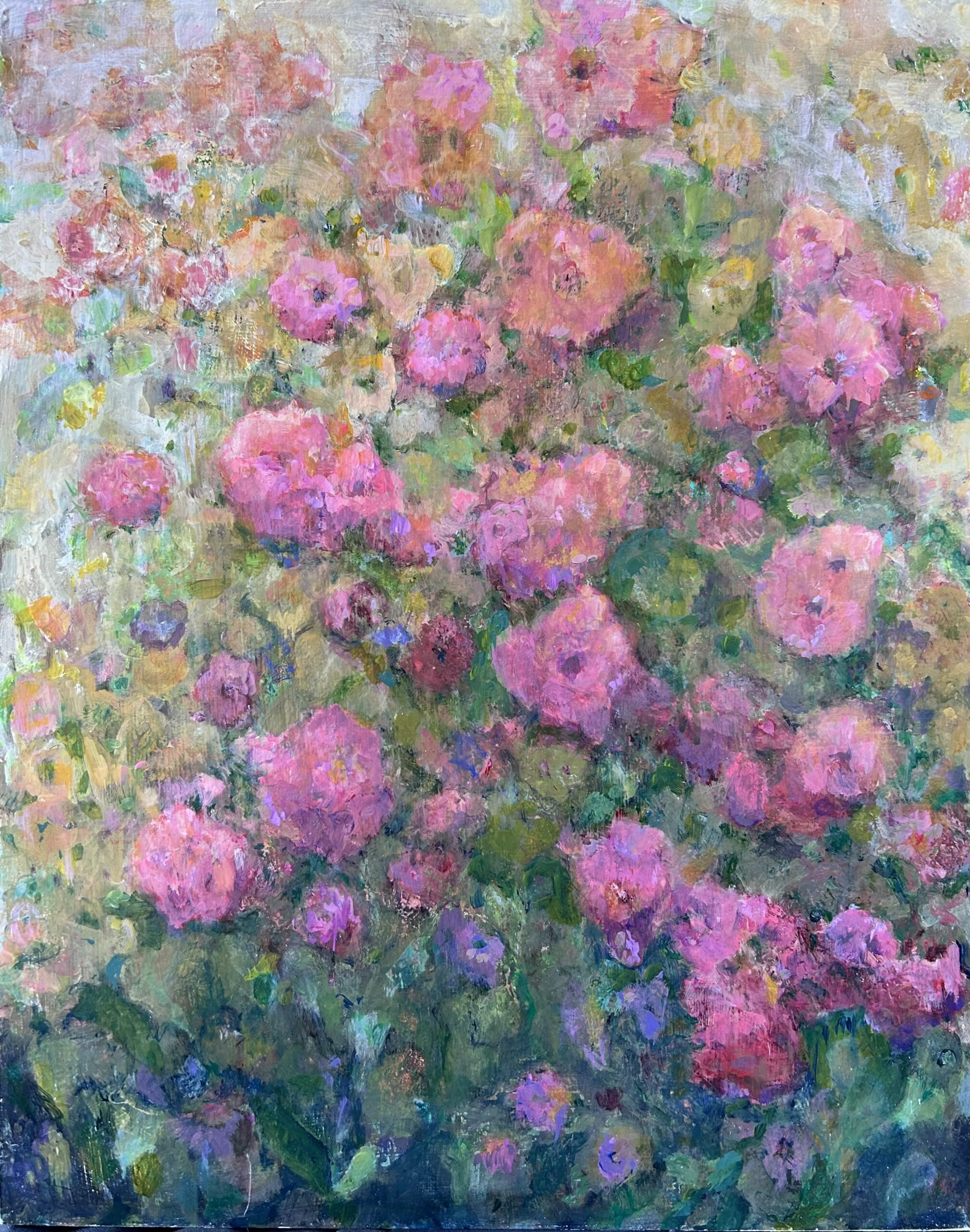 As a gardener and an artist, I like the lush, rich colors of roses set against their green leaves. This painting celebrates the color and looseness of a wild, overgrown garden. In filling the frame entirely with blossoms, the viewer is immersed in the experience..