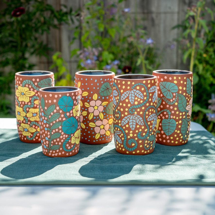Wheel-thrown, hand-painted and carved cylindrical vases.