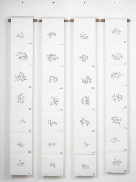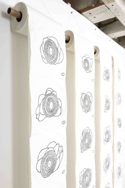 It Didn’t Have To Be This Way (California Pandemic Toll) is a large-scale installation of embroidered rolls of paper towels that visualizes the number of Californians who died during the pandemic. The intent of this installation is to communicate uncomfortable, yet important, statistics in a way that is more memorable, thought-provoking, and accessible than the usual bar or line graph.