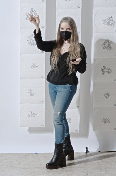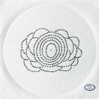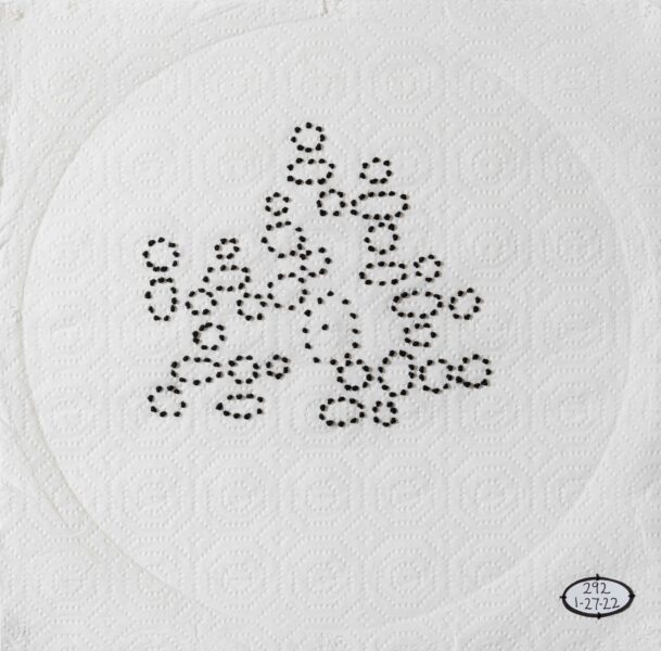 Each stitched knot represents one person who died from COVID-19 in California. I used a stitch with a spherical shape because it is a perfect reference to the shape of a coronavirus virion.