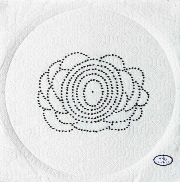 Each paper towel sheet is one day of deaths. There is a tag in the lower right hand corner of each paper towel sheet with a date and the number of people who died from COVID-19 in California on that date. That is also how many stitches are on that sheet.