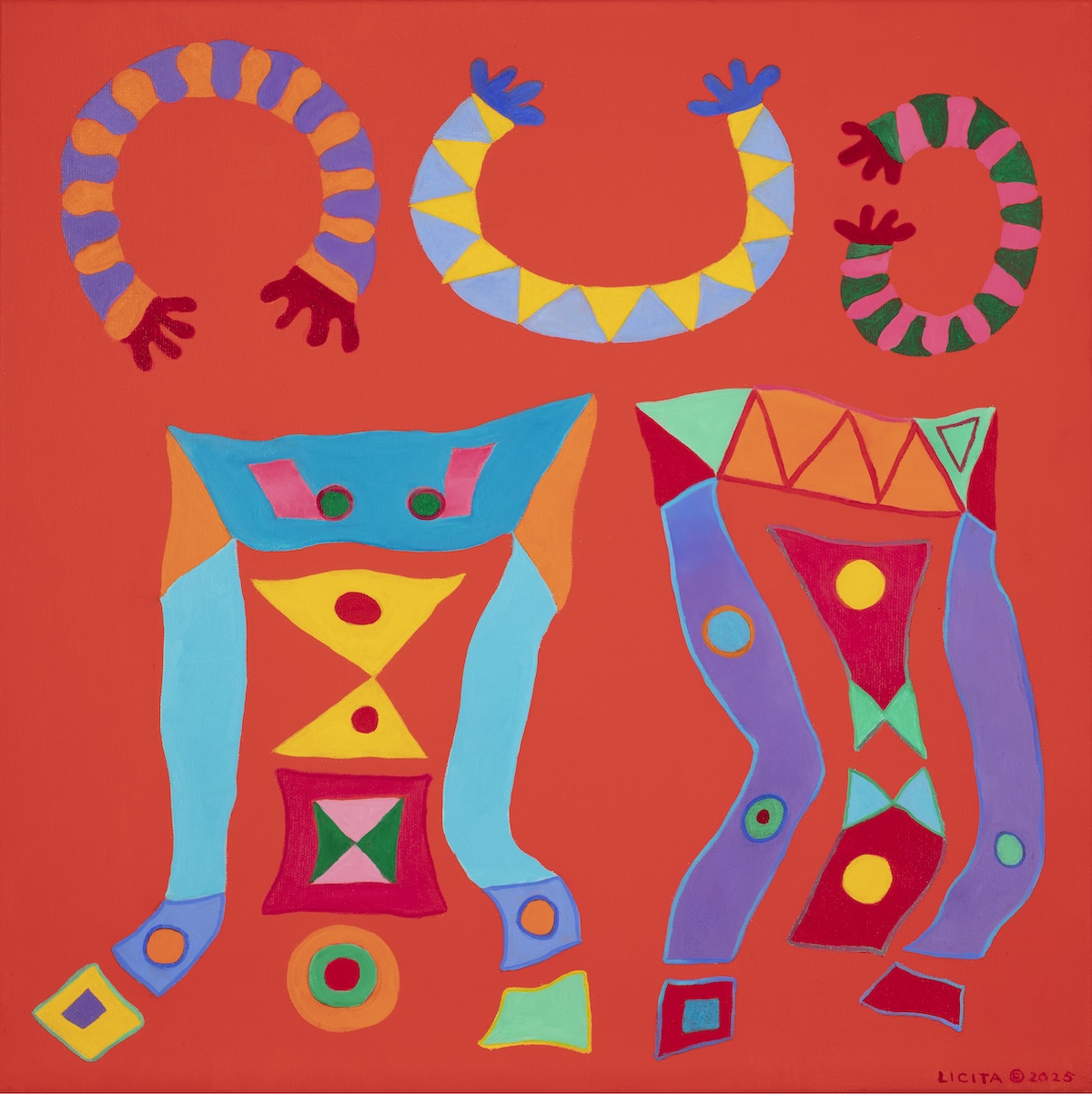 On a red acrylic field, I have painted various shapes which are patterned. All are in bright colors. This painting follows the theme of ‘Remembering Chicano Park’ , a park in San Diego, CA part of which is under an overpass. The pillars are painted in bright Chicano-themed designs.