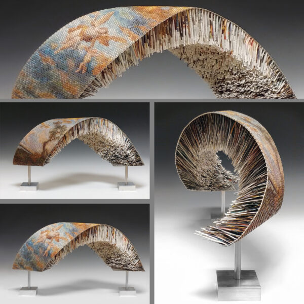 Altered Book – The transformation of the traditional needlepointing technique was reimagined into a completely different realm. Instead of using the traditional needle, embroidery thread and canvas; shredded paper and perforated aluminum was used. The perforated aluminum was hand formed into the desired shape. Next a book on modern art was selected and the color plates were shredded to use as the pallet to make the imagery. The shredded paper was individually selected and woven into the metal leaving both ends free. This process was then repeat thousands of times. I enjoy this challenge and find it rewarding when a multi-sensory experience is achieved for the viewer.