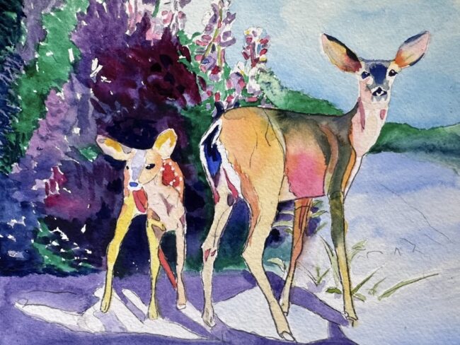 This vibrant watercolor features two deer, one adult and one fawn, standing side by side against a lush backdrop of foliage and flowers. The colorful surroundings and the deers’ multicolored coats create a whimsical and lively scene.