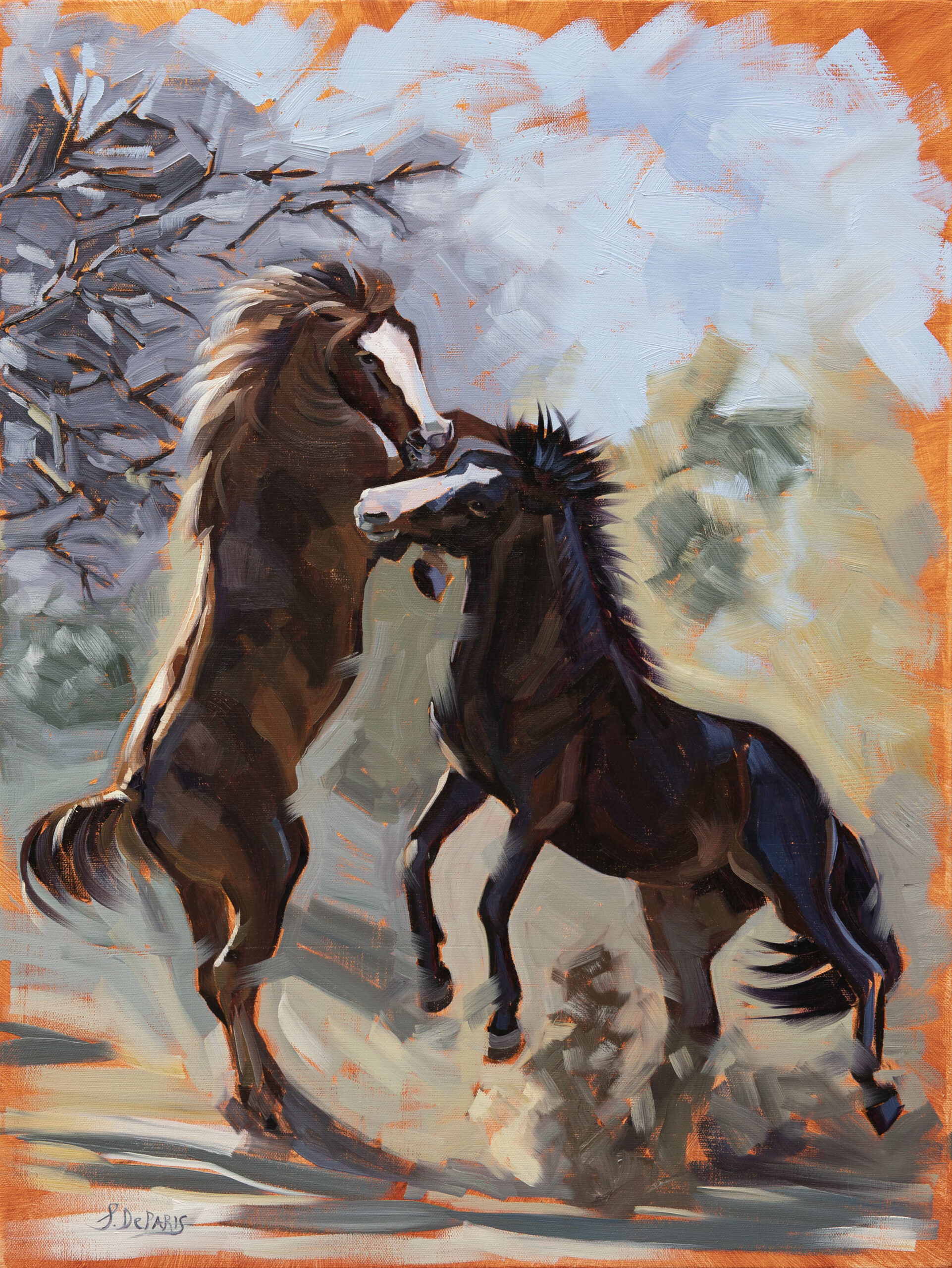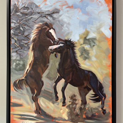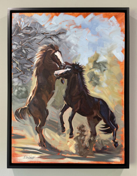 Two mustang stallions spar for dominance over their herd. A vivid orange underpainting shines through between bold brush strokes. This painting is currently featured in the 2025 “Bold and Free” online juried exhibition at Marin Society of Artists.