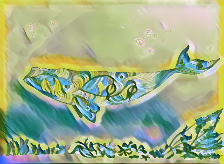 In the painting, the emerald shallows and golden haze of light mirror the bay at peak season, while sinuous motifs echo calls pulsing through the water. With only ~384 whales left, every quieted propeller, every safer line, and every calf makes the difference between a fading echo and a growing chorus.