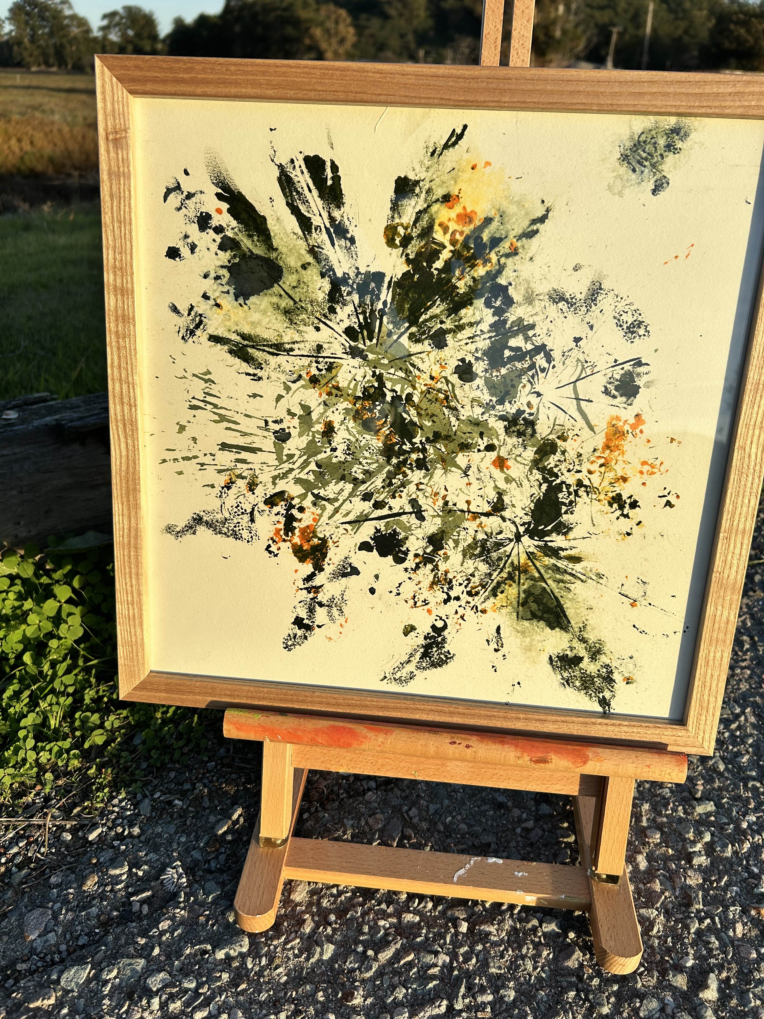This abstract botanical painting consists of natural, earthy tones, primarily dark and light green, accented with splashes of orange and yellow. The focus is on the emotional and textural qualities of a walk in nature on a Fall day.