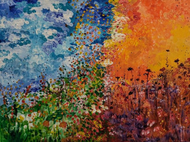 Fire and Rain is a vibrant celebration of contrast and harmony. On one side, cool shades of blue and soft whites evoke refreshing rain showers, with delicate flowers blooming in lush green fields. On the other, fiery tones of orange, red, and gold radiate warmth, as wildflowers sway under a blazing sun. The painting’s dynamic, dotted textures and bold color shifts create a striking balance between calm and intensity, capturing the beauty found in nature’s extremes.