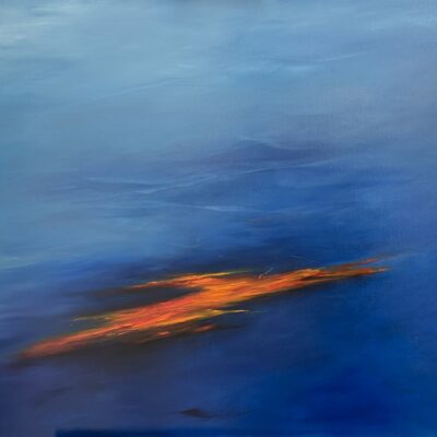 Abstract painting of soft blues and purples with a slash of reds and oranges near bottom