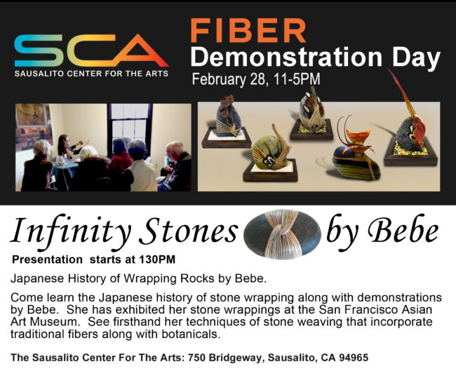 Japanese History of Wrapping Rocks by Bebe. Come learn the Japanese history of stone wrapping along with demonstrations by Bebe. She has exhibited her stone wrappings at the San Francisco Asian Art Museum. See firsthand her techniques of stone weaving that incorporate traditional fibers along with botanicals.