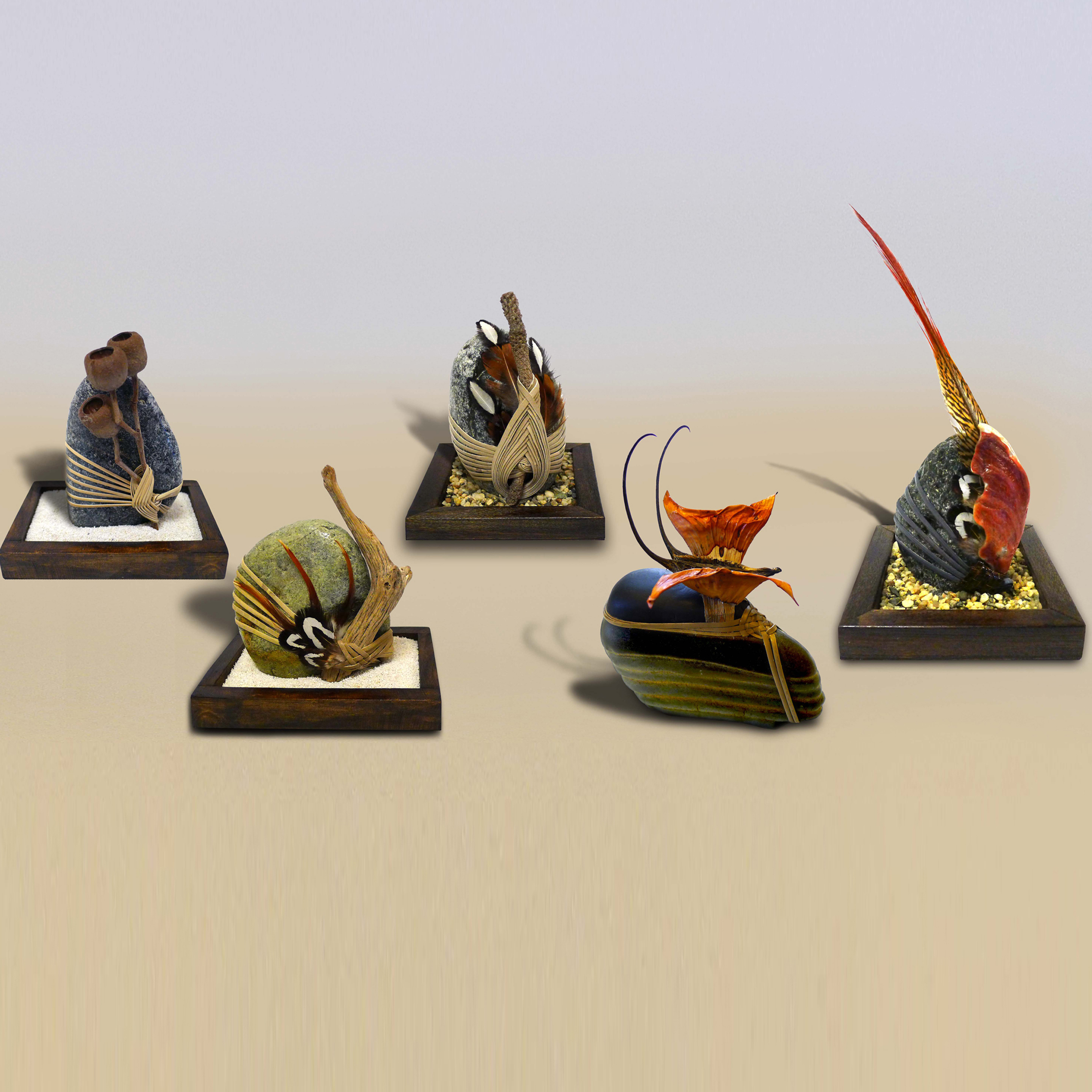 Japanese stone wrapping by Bebe. She has exhibited her stone wrappings at the San Francisco Asian Art Museum. Her techniques of stone weaving incorporate traditional fibers along with botanicals.