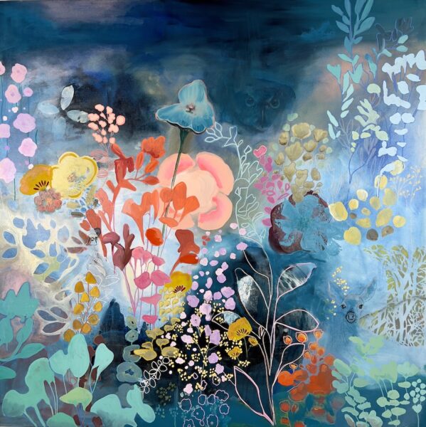 Forest Guides is a layered floral abstraction alive with color, movement, and mystery. At first glance, it reads as a lush, dreamlike garden—floating botanicals, soft gestures, and vibrant blooms drifting through a deep blue-green atmosphere. But linger a little longer, and the forest begins to speak.