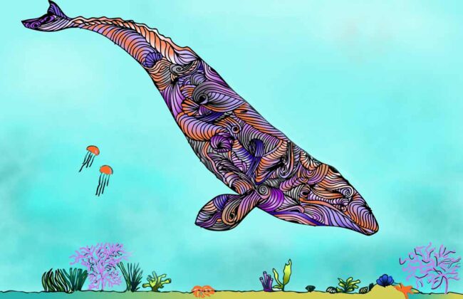 A single gray whale glides over a pastel seafloor, its body woven from ribbons of amethyst, coral, and ink. The swirling motifs are drawn from whale sounds and waveforms—a visual score for a life lived close to the coast. Around it, jellyfish drift and low corals glow, hinting at the near-shore, shallow world where gray whales spend so much time.
