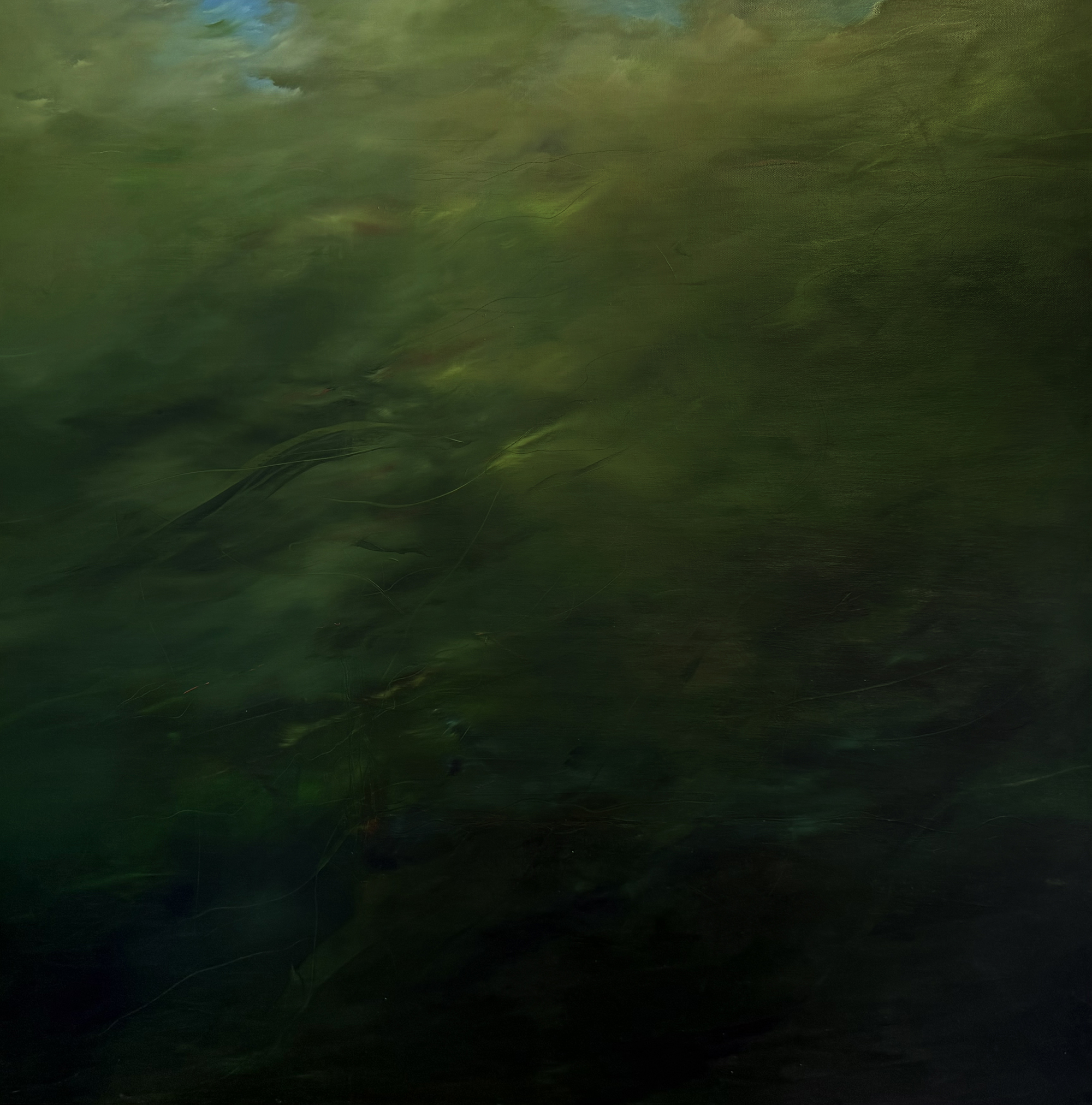40″h x 40″w – Abstract oil on canvas in predominantly greens suggesting being enveloped in a forests green light