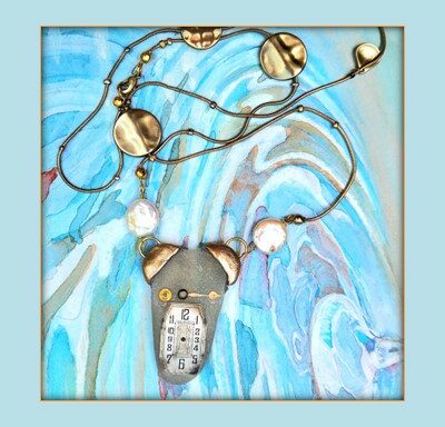 Watchface and hand on sea glass with vintage chain