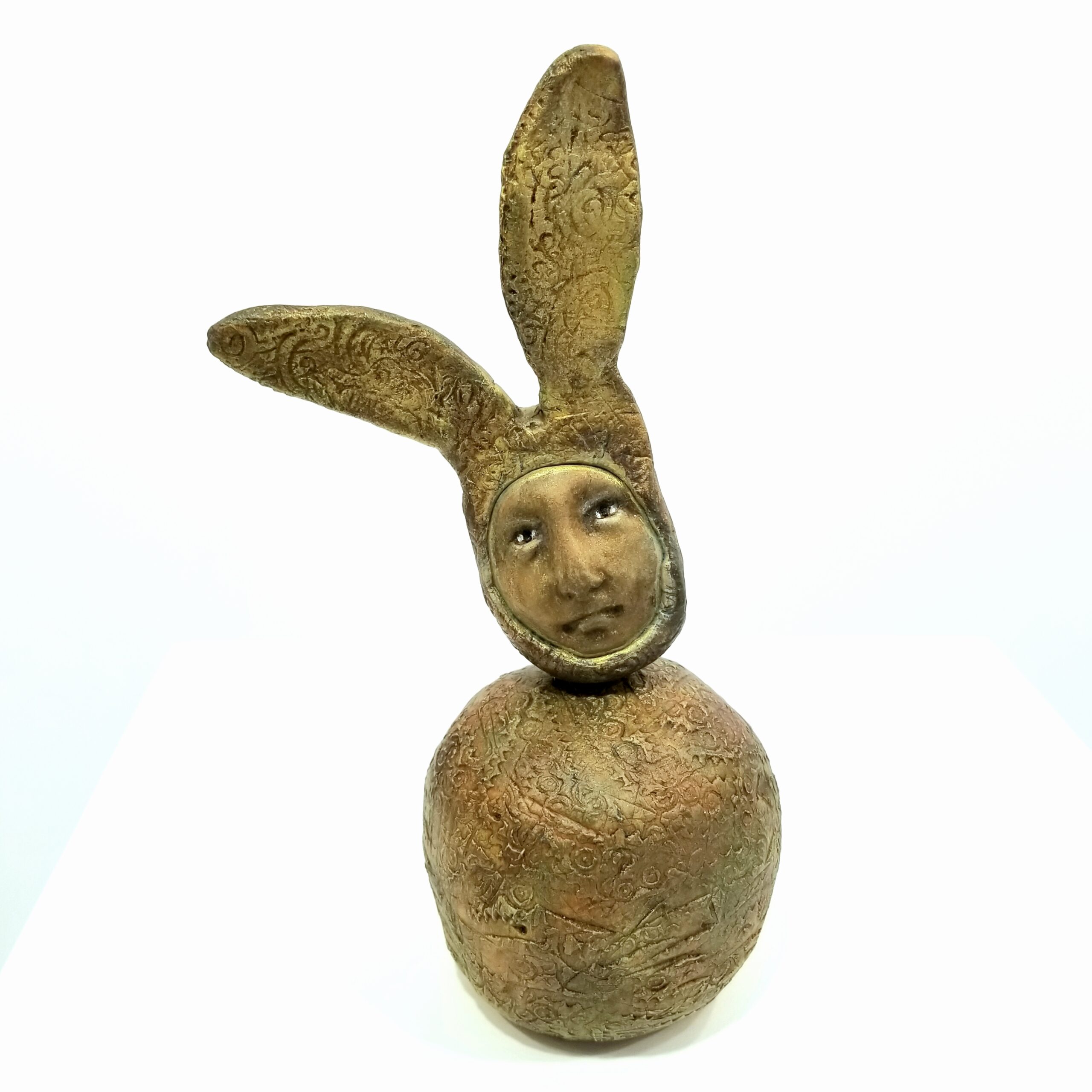 Hand formed clay sculpture with tinkling bells encased inside. Painted with acrylic and pastels and sealed with fixative.