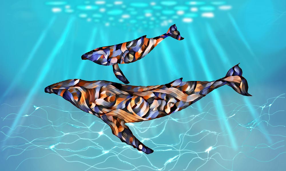 The woven textures in the whales’ forms echo that living choreography: breaches and tail-slaps above, quiet nursing below, and the hush between notes when mother and calf drift through a shaft of light. In this moment of stillness, the sea becomes a lantern, and their bodies become the lantern’s script—turquoise water writing light onto skin as they hover in a world made of sound, motion, and glow.