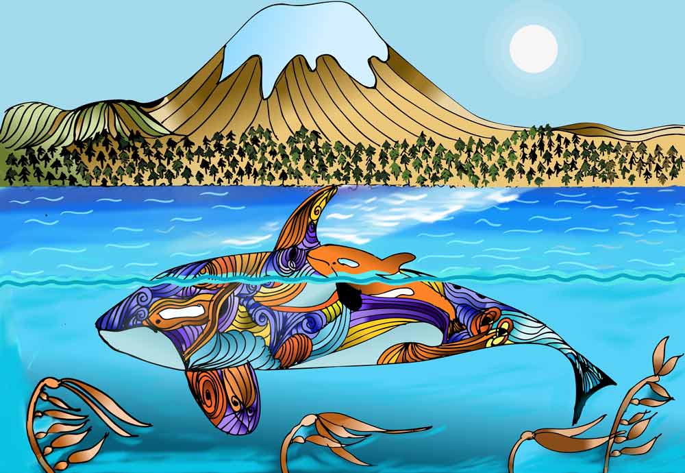 The patterned surfaces are drawn from whale sounds—motifs inspired by spectrograms and echo-like waves. Look closely and you’ll see whale sound waves/patterns reflected across the mother’s body, a visual metaphor for how sound inhabits and defines orca life: it is how they find salmon, navigate, and communicate, passing knowledge through matrilines from grandmother to mother to calf.
