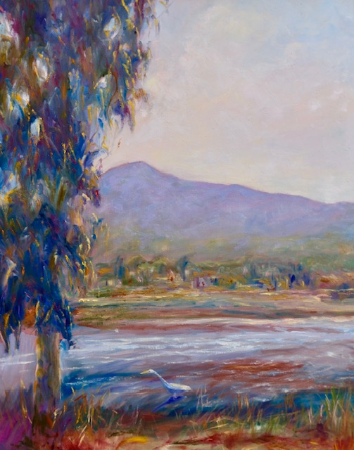 A lone egret hunting in the Corte Madera creek under the eucalyptus with Mt. Tamalpais at Sunset in the background.
