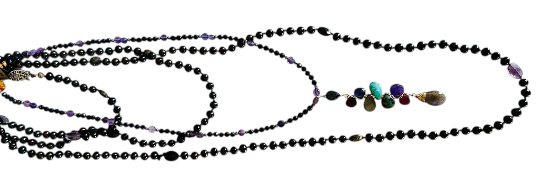 Paired with hand knotted black pearls necklace and bracelet with gem accents including onyx, amethyst, pyrite and labradorite. can be clasped together to make an extra long multi wrap necklace. $850