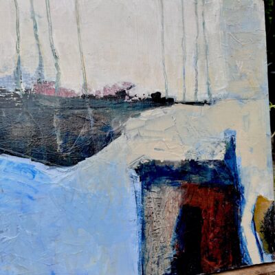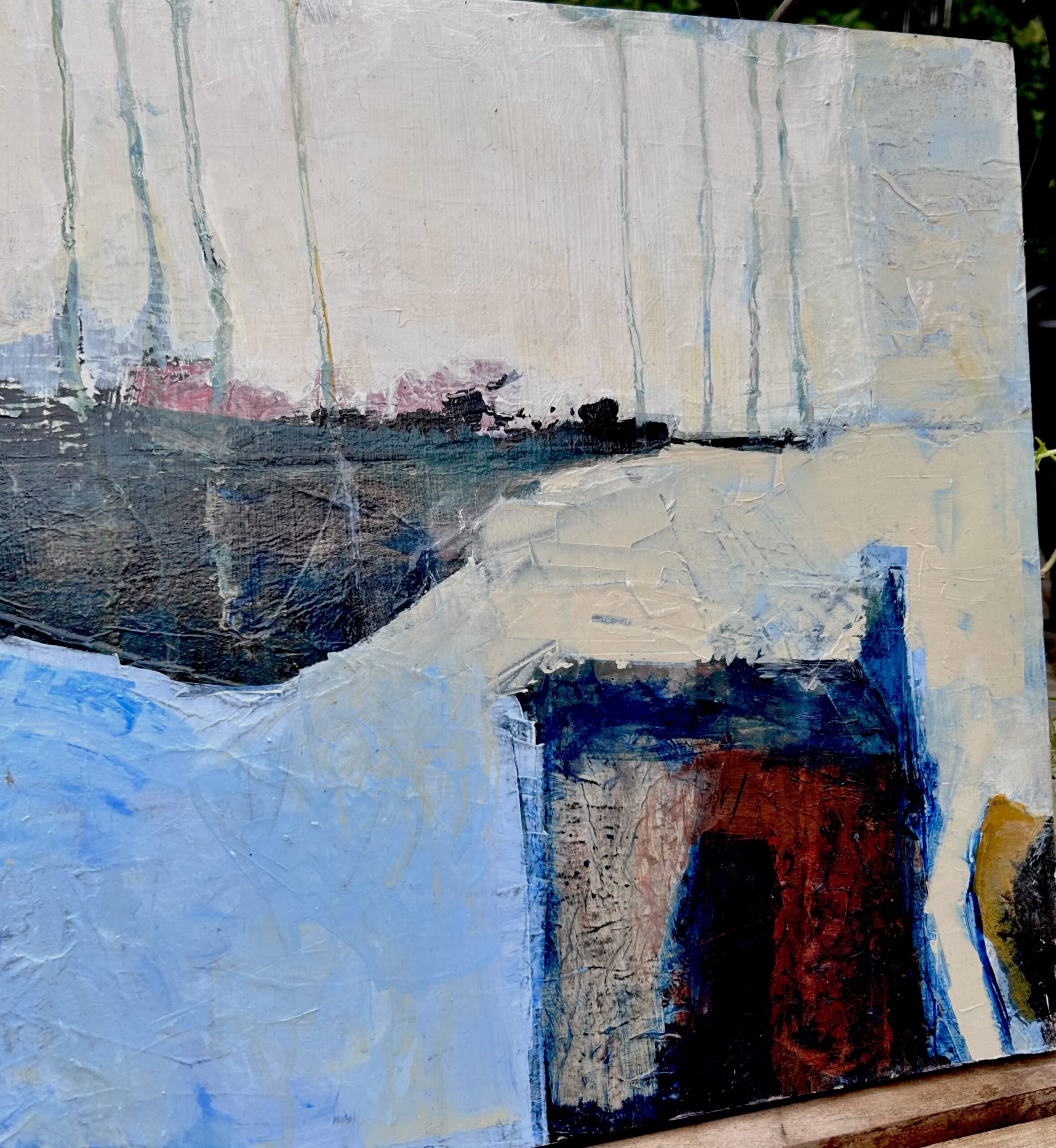 The painting is divided into distinct zones of color that suggest a fragmented, semi-abstracted view of a landscape. There is the dominant blue and white which is contrasted with a dark horizontal band resembling a shadow. This splits the composition, adding depth. An earthy toned rectangular shape provides a grounded focal point against the cooler surrounding colors. Several thin, vertical lines of pale blue paint drip from the top of the canvas, suggesting rain, melting ice, or trees. The surface has been built up and scraped back several times revealing previous layers.