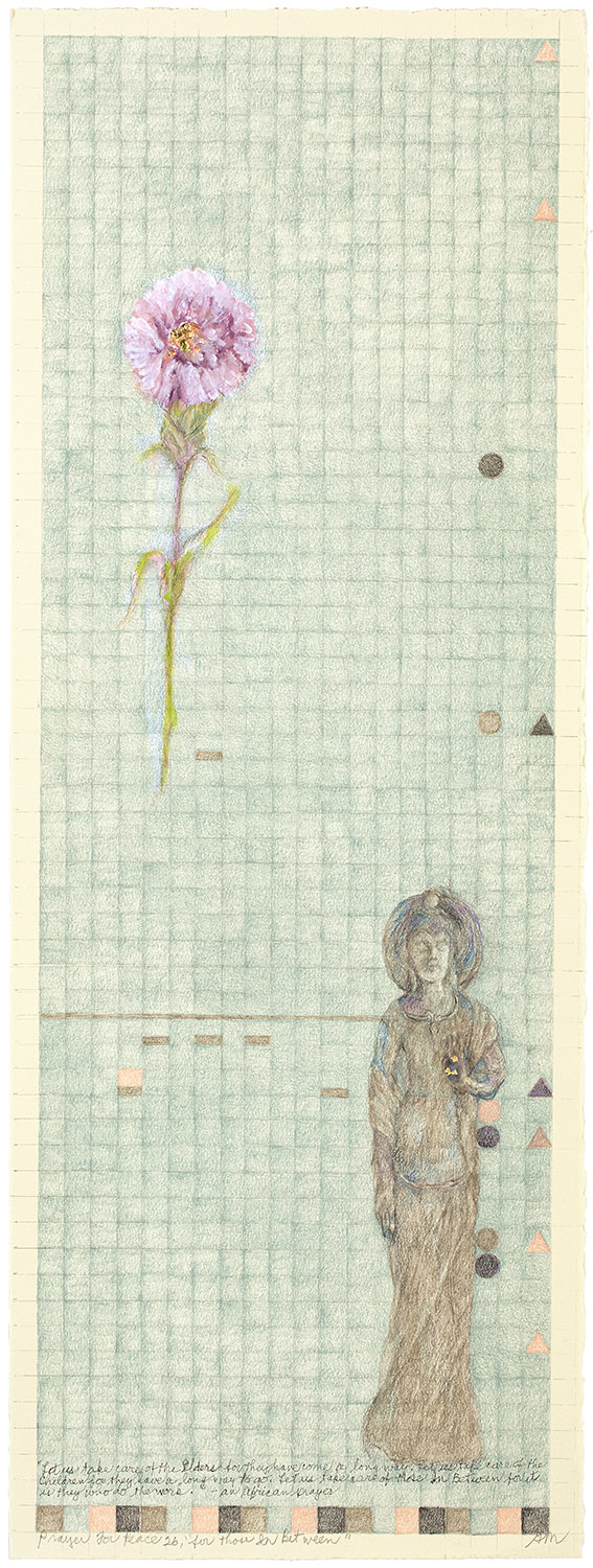 Kwan Yin, the female Buddha of compassion and mercy blesses the viewer while a flower rises above, sending love and peace despite hardship and suffering. The text from an African prayer written at the bottom, “Let us take care of the Elder…, let us take care of the Children…, let us take care of those In Between for it is they who do the work”. Unframed at the moment but will frame very soon. Just finished.