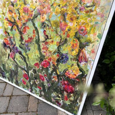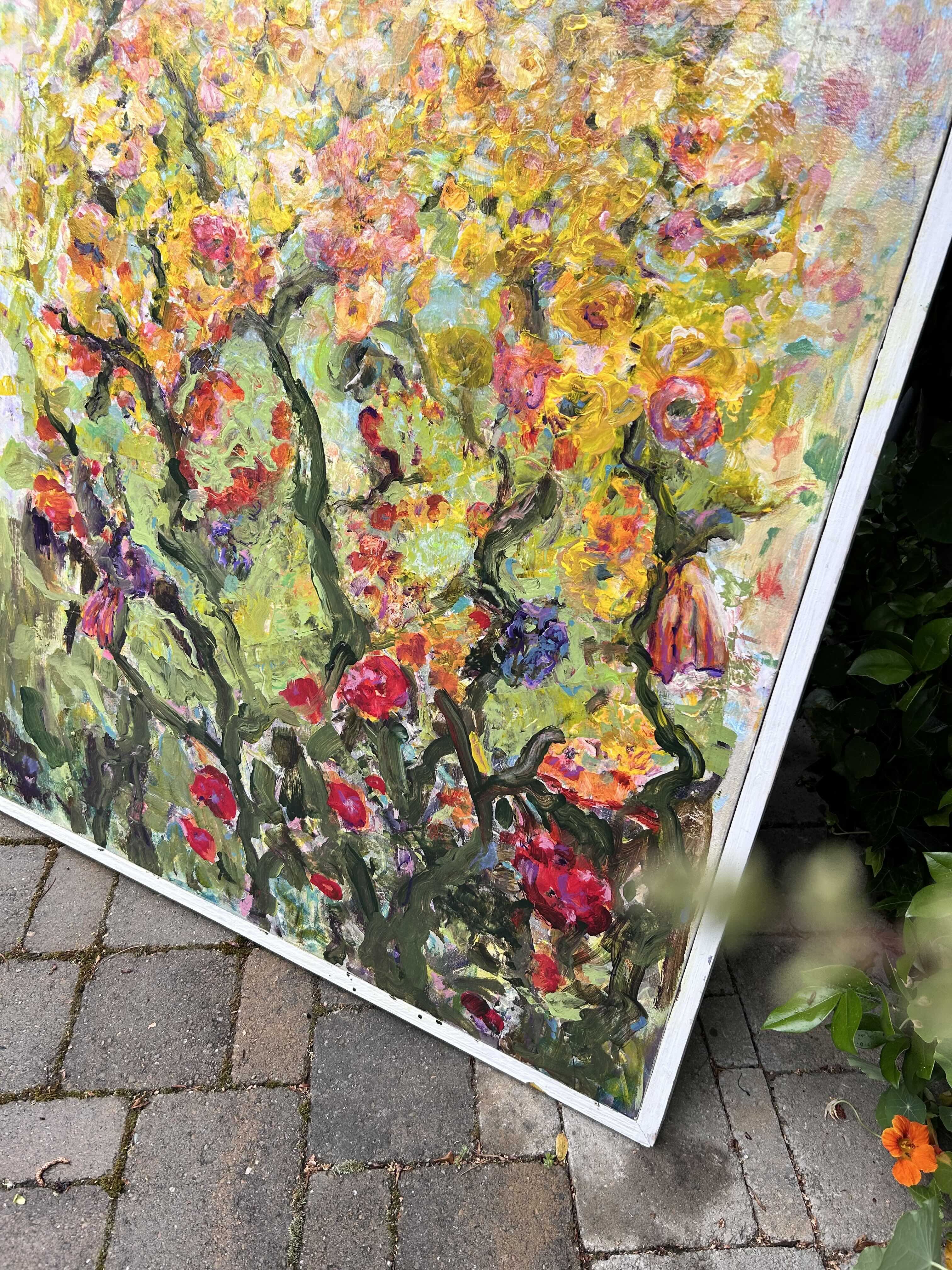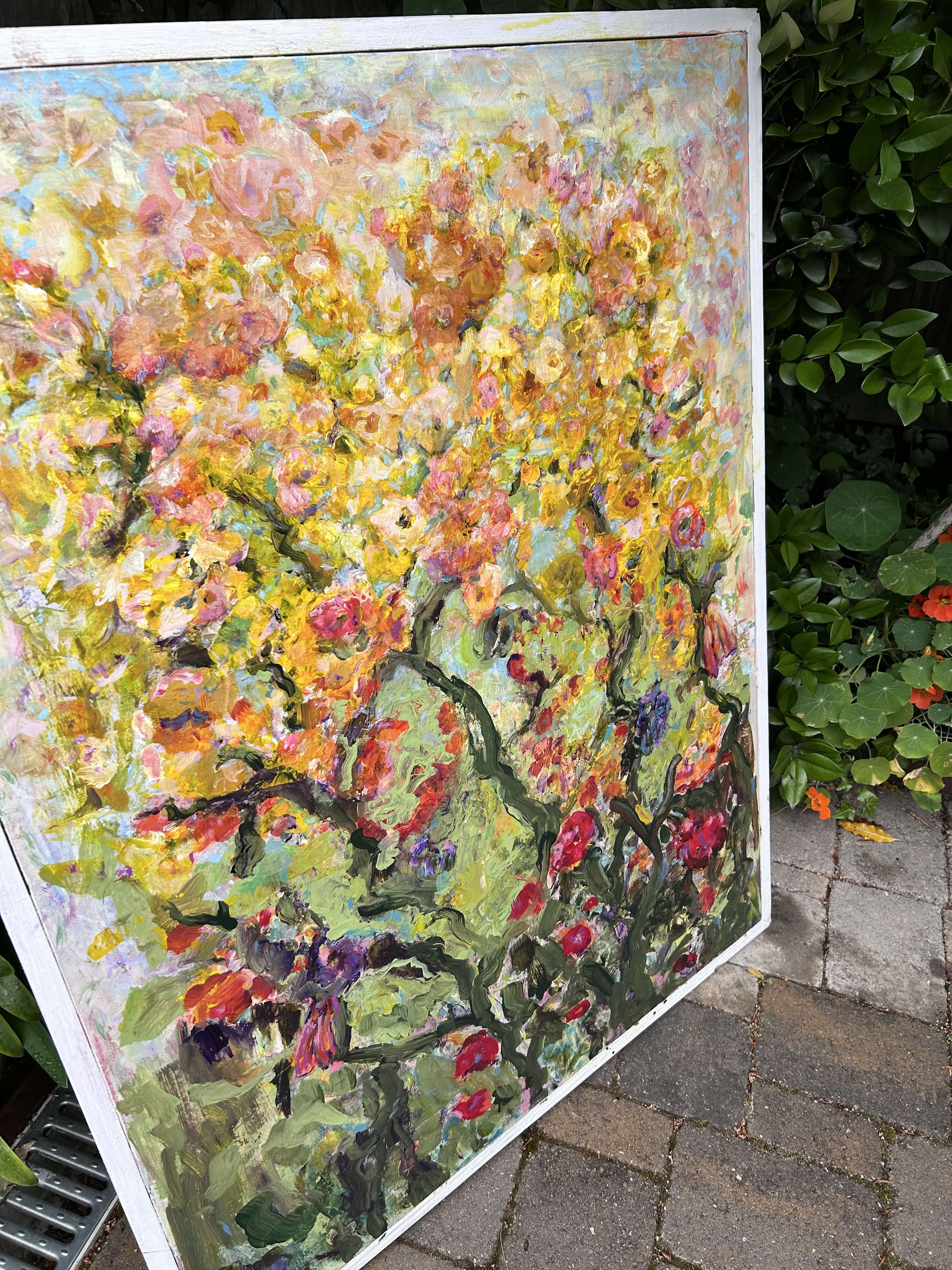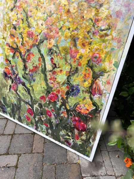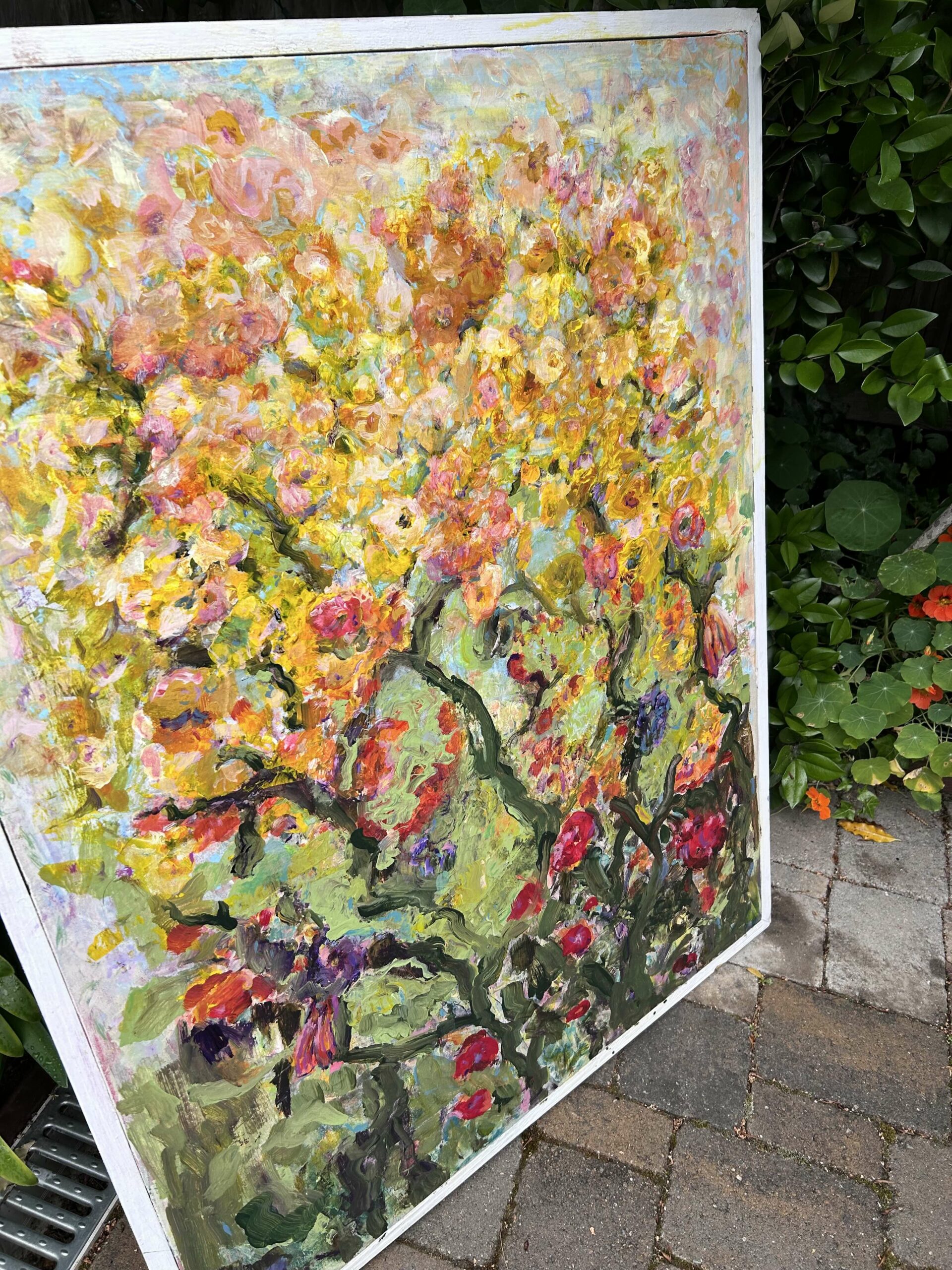 This painting is bursting with the color and energy of a garden in full bloom. It’s dominated by bright yellows, soft pinks, and deep reds with dark, gestural green branches twisting through the center, anchoring the composition. The paint is applied thickly, over collaged elements, adding a three-dimensional quality and shimmer to the petals and leaves. It is sure to convey a sense of joy to any setting. It is mounted in a 3/4 inch wood frame that has been painted white.