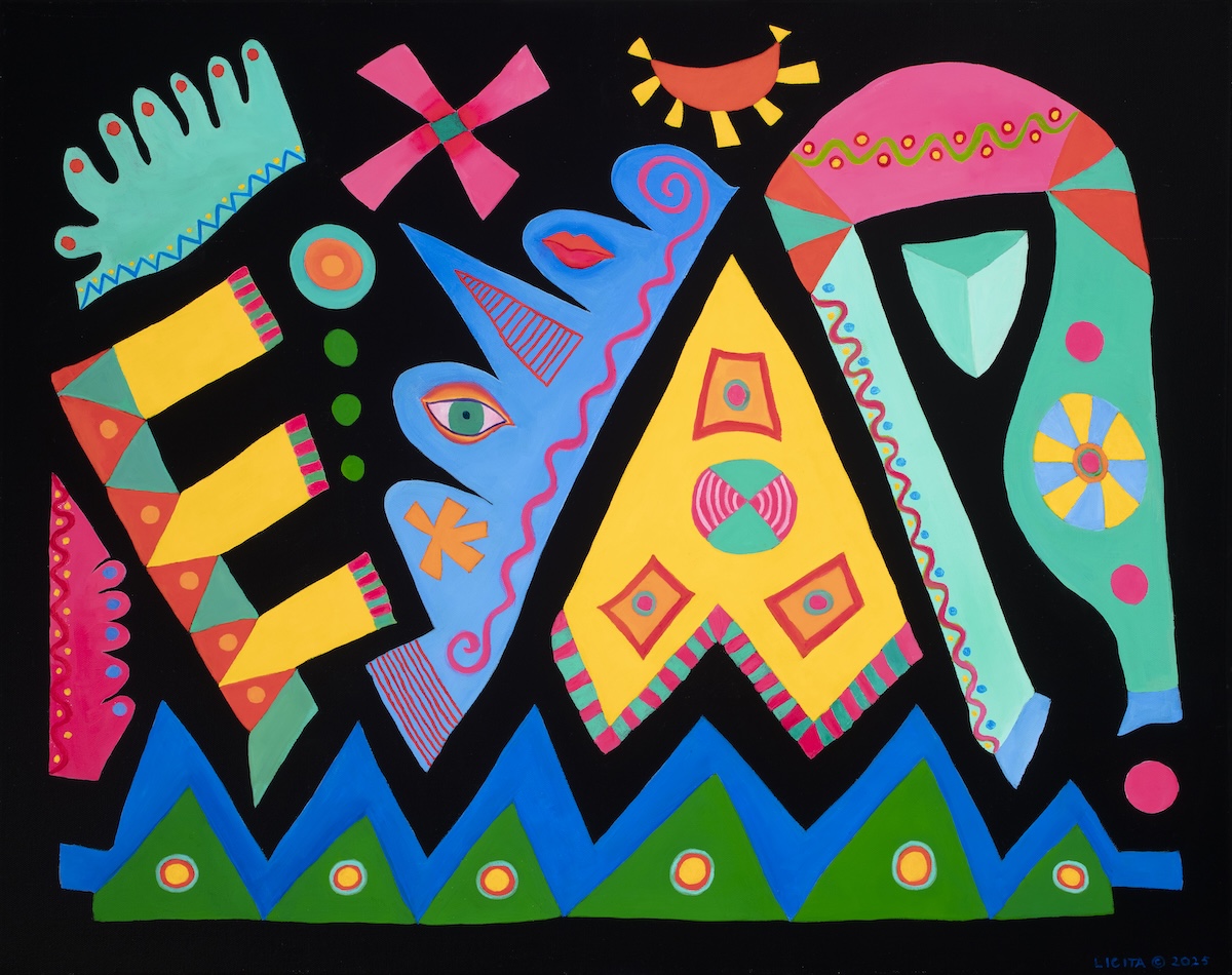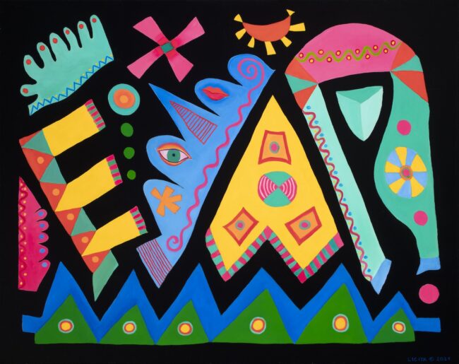 This 22″x28″ acrylic and oil painting on canvas is part of my Alebrije-Inspired series. Alebrijes are a form of Mexican folk art: they are carved wooden figures that are painted in brilliant colors and patterns. My forms and shapes are not typical alebrije subjects; they are abstract. The colors are bright, the forms are patterned. The name Razzle Dazzle refers to showy, flashy.