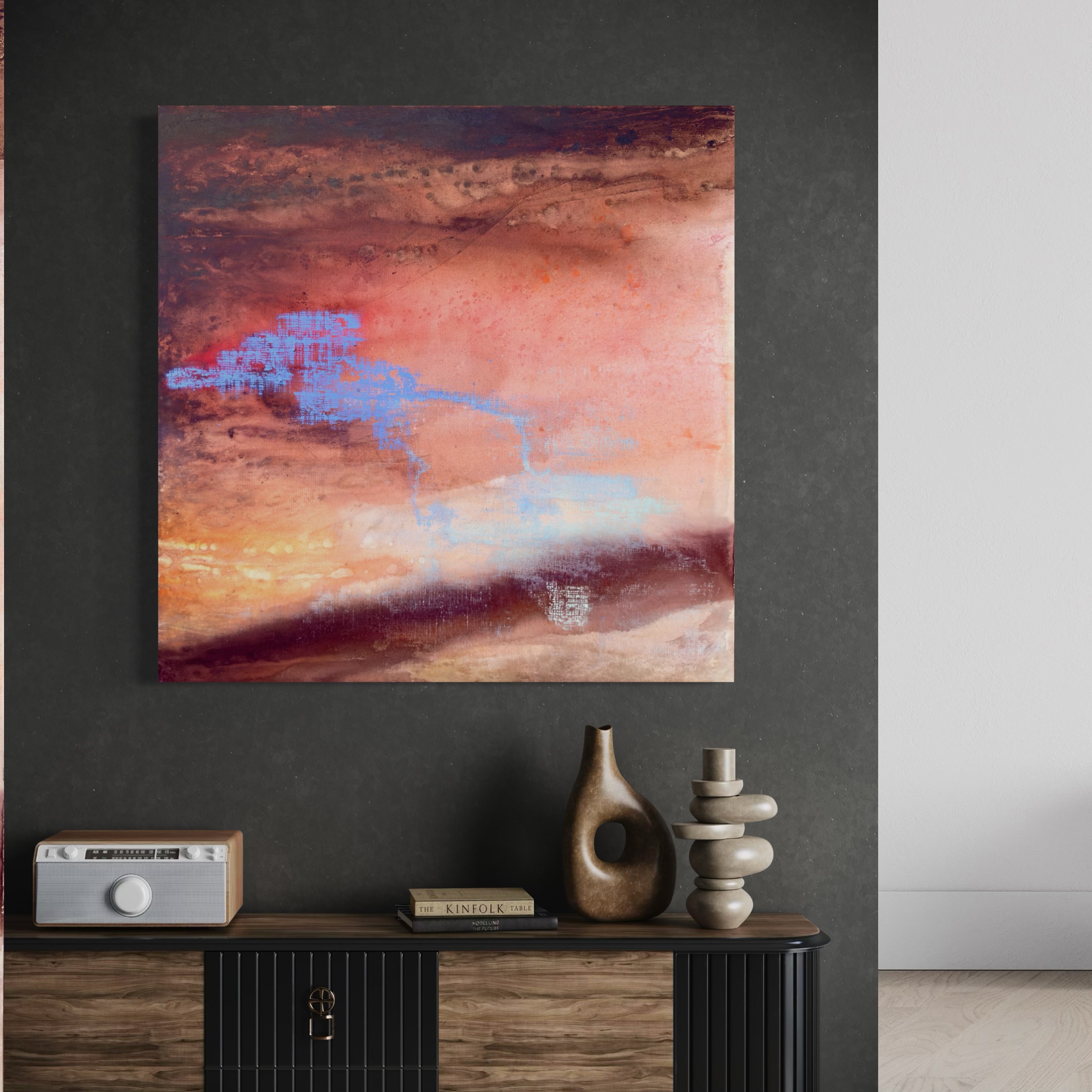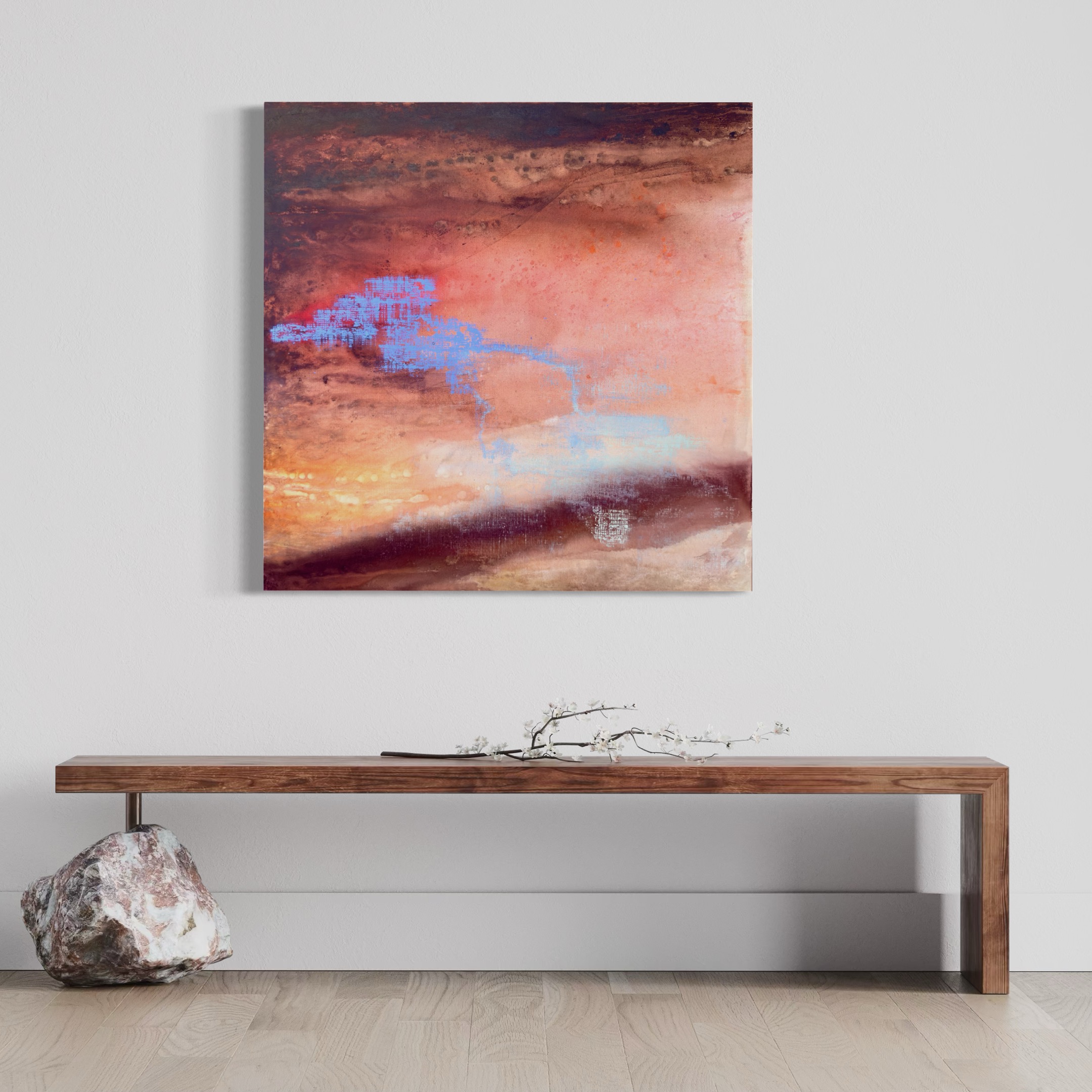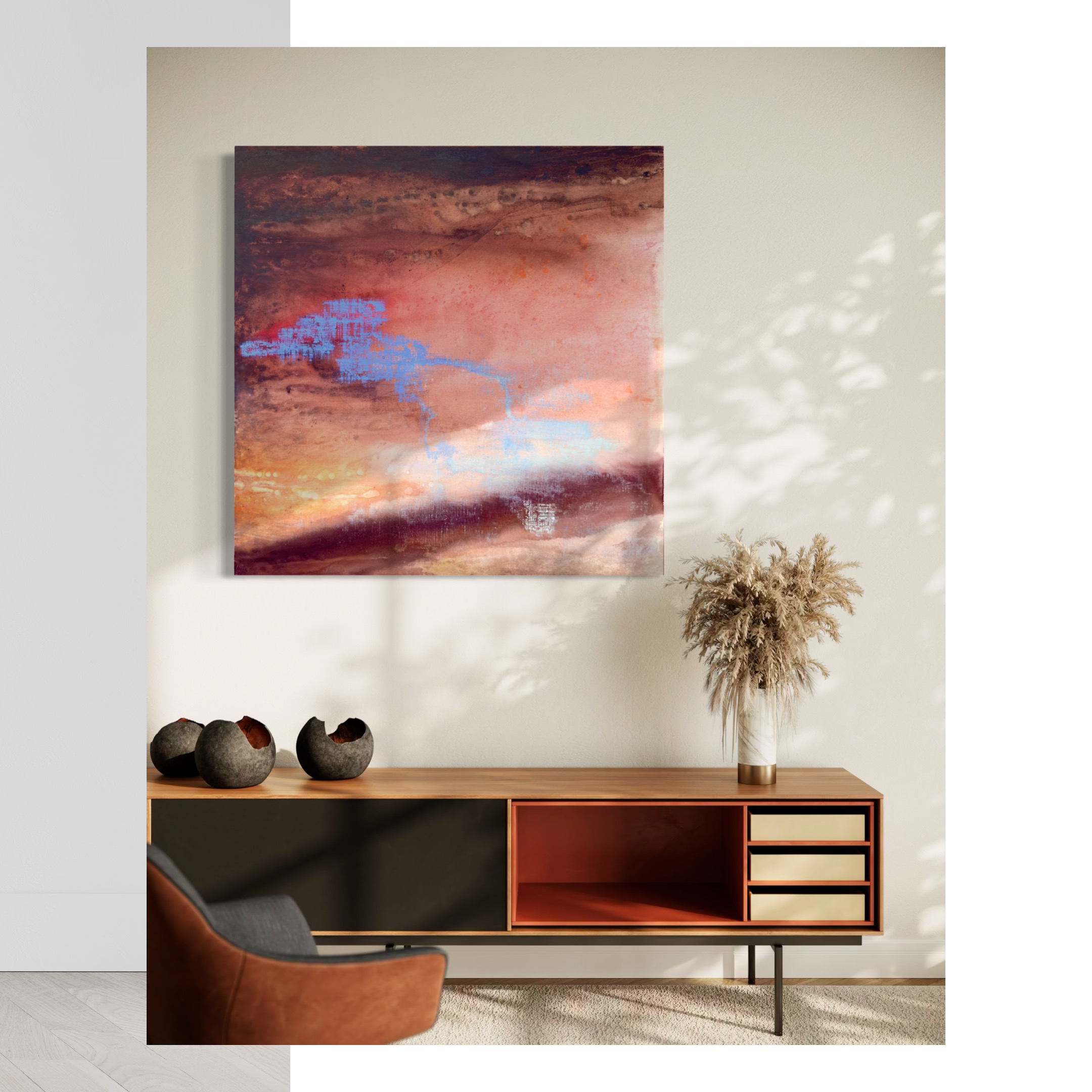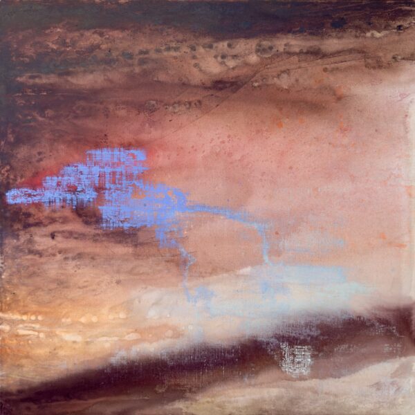 In ‘Residual of the Cipher’, the organic, rusted topography of the canvas is interrupted by a fragmented blue geometry. If a ‘cipher’ is the secret code of our identity, then this piece captures its lingering afterimage-the digital ghost of a thought that remains after the initial moment of clarity has passed.