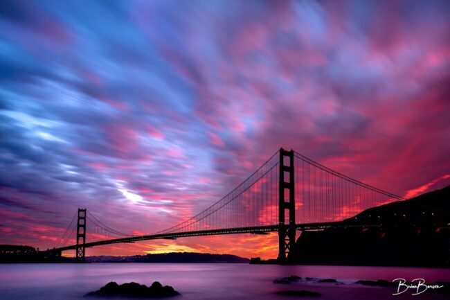 Long exposure of an incredible sunset over Golden Gate Bridge. Winds were moving the clouds into the Bay fairly rapidly creating a lot of movement in the resulting photo.