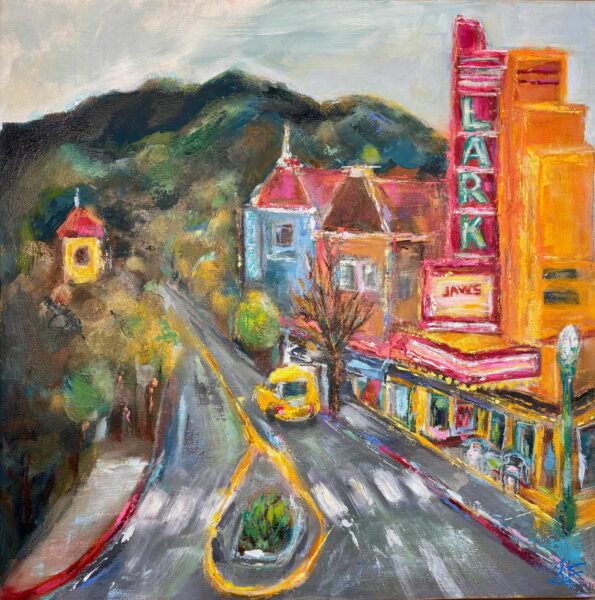 This scene is of downtown Larkspur. The Lark Theater is an icon and when JAWS turned 40, it was screened and I went to see it here with a dear friend. I have seen JAWS probably thousands of times, but never on the big screen and this was the perfect place for it. We screamed and watched on the edges of our seats just like we would have had we been old enough to see it when it first came out. This painting is my homage to a special little town and a special giant of a film and tale of a fish.