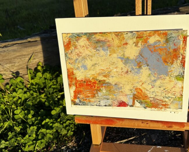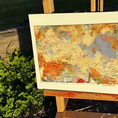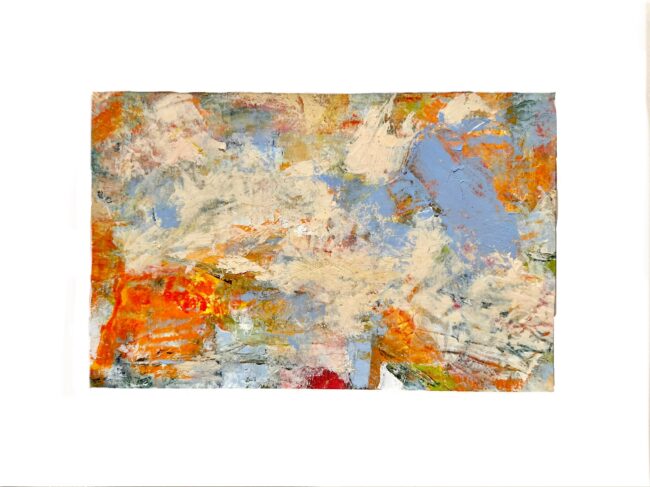 This painting has an uninhibited quality enriched by the palette of warm oranges and reds that contrast with cool blues and hints of green. Creamy off-white tones interspersed throughout soften the bolder colors and adds luminosity. Color and shape create a rich, textured surface evoking a landscape or even an emotional outburst.
