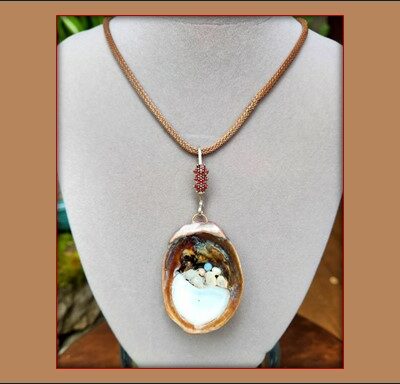 Slipper shell with opal by Patricia Spilman Published: April 28, 2026 (16 hours ago) Contact For Pricing CategoryPRICE / SIZE / $ 1-$500ART MEDIUM - 3D ART / JewelrySlipper shell focal piece with Ethiopian opal and geode crystal. Garnet ring drop. Send Message Your Name * Your Email * Subject * Message * Website Address