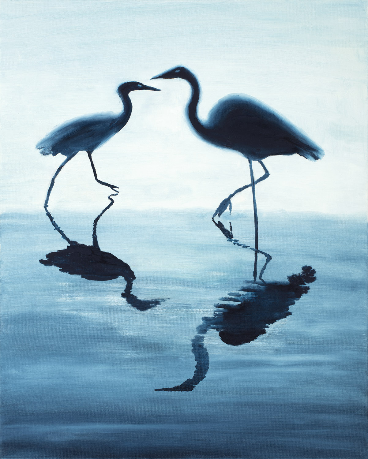 A tranquil scene of two elegant snowy egrets wading gracefully through the shallow waters of the Santa Venetia Wetlands in San Rafael, California. Their pristine forms and perfect reflections create a symphony of symmetry against the indigo tones of the wetland waters.