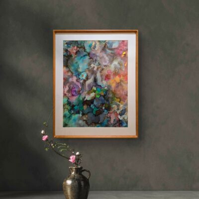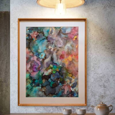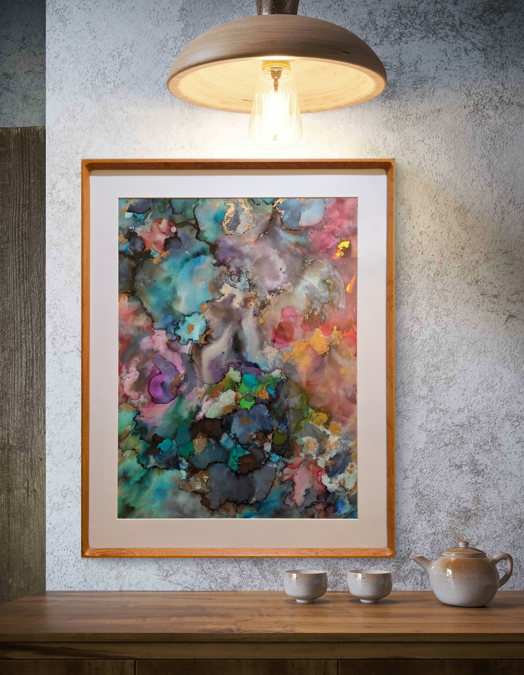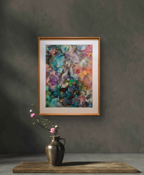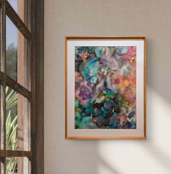 Did you say color? A vibrant interplay of movement, where flowing pigments merge into luminous forms that feel energetic, immersive, and alive—inviting viewers to get lost in the rhythm of color. This piece is 20 × 26 in. matted in a 22 × 28 glass frame