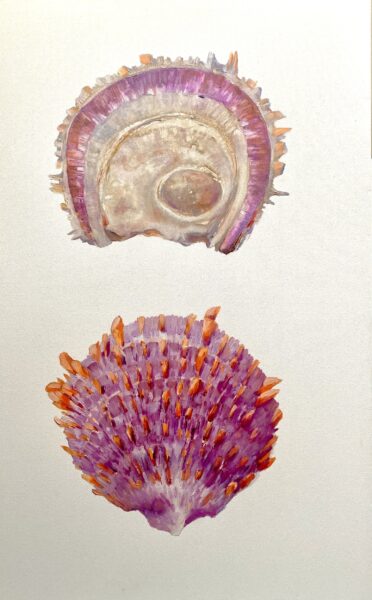 A oil painting of a Spondylus shell found on the eastern Baja Peninsula. It was discovered during a recent trip taken in celebration of the 85th Anniversary of the historical expedition by John Steinbeck and Ed Ricketts in the 1940 Steinbeck novel Sea of Cortez where they record the experience of documenting the littoral of the tidal zones in the Sea of Cortez.