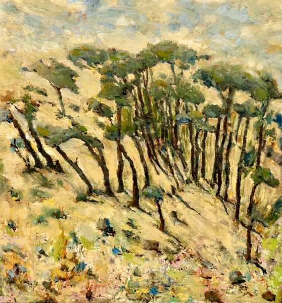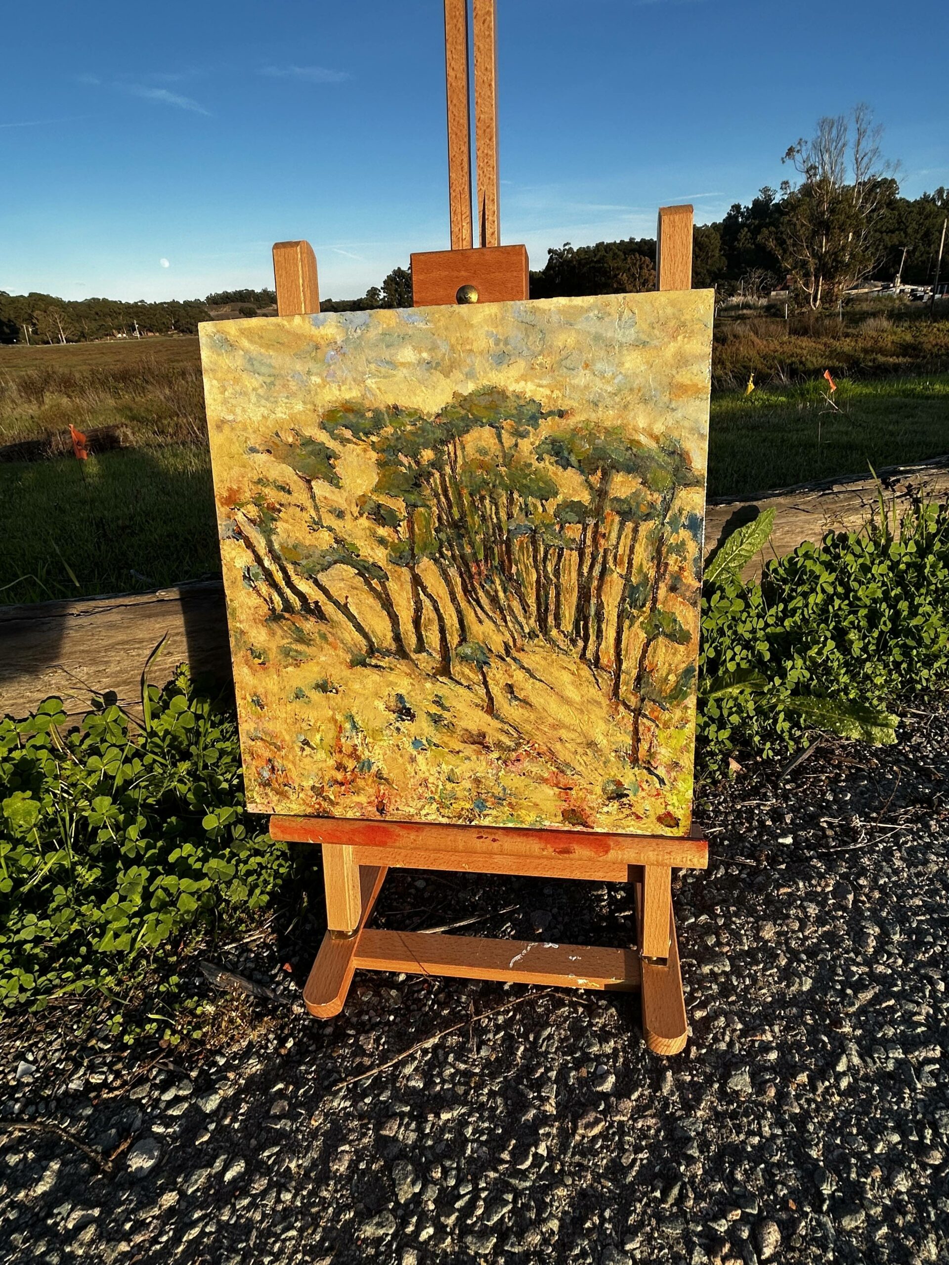 This oil painting could be any one of numerous hillsides in Northern California, interpreted through my artistic vision. It features visible, short, thick brushstrokes. The earthy tones provide a strong anchor to the scene while the trees and foreground exhibit colorful touches that add vibrancy to the landscape. The sky’s soft pastel hues reflect our California sun drenched days.