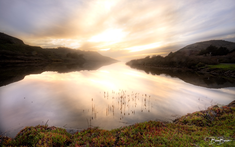 Incredible stillness falls over the lagoon in the Marin Headlands as the incredible bright sun begins to set to the west.