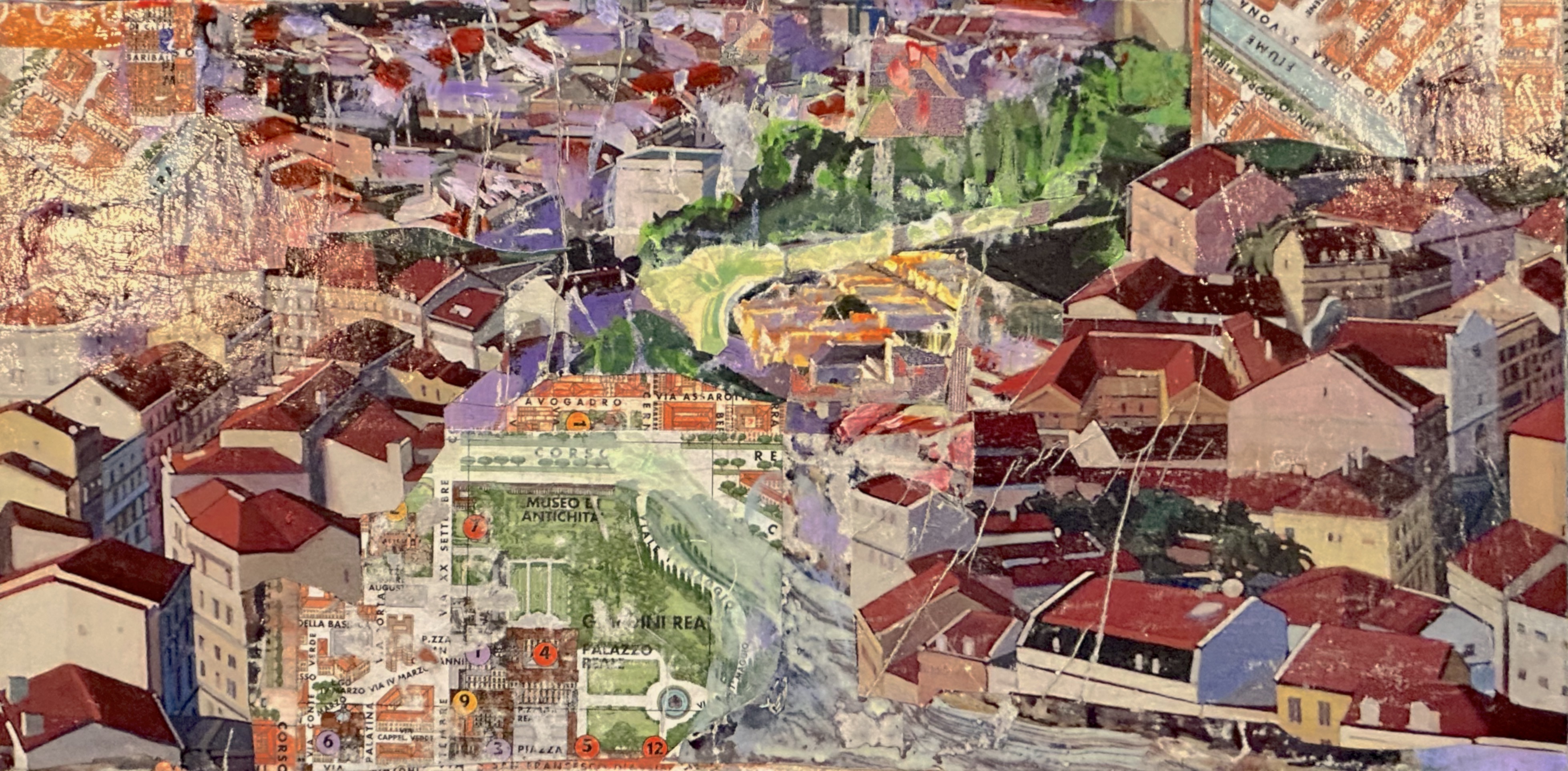 This small collage/painting integrates maps (Turin, Italy) with images of buildings with red tiled roofs evoking a memory of travel. It presents multiple viewpoints and layers of information simultaneously. The eye is drawn around the painting with text, paths, shadows and highlights. It invites exploration.