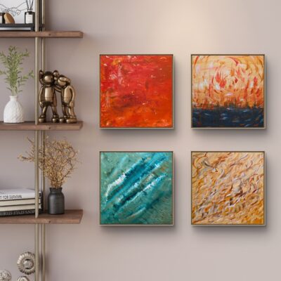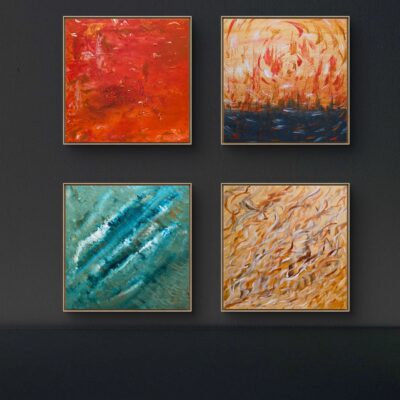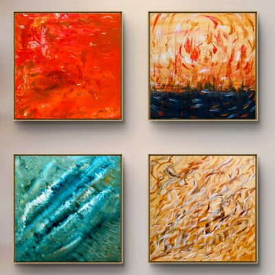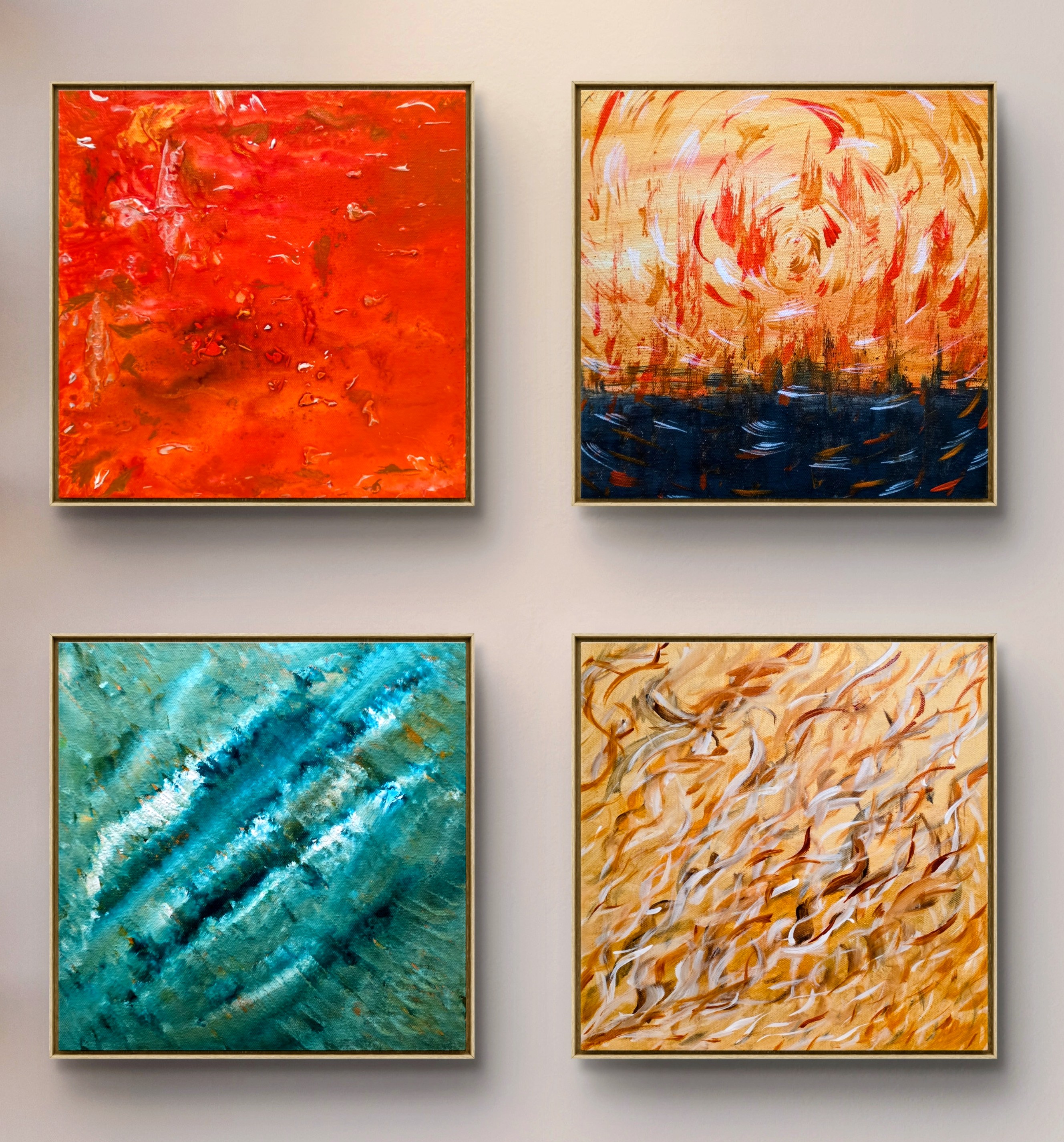 A series of four 12×12 abstract paintings exploring movement, energy, and layered texture. Each work was developed through an intuitive process guided by deliberate mark-making and evolving color relationships. Warm, fire-like reds and golds contrast with cool, fluid blues and teals, creating a set that feels both connected and distinct.
