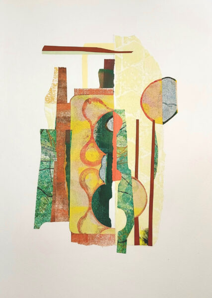 Mixed Media Collage with hand painted/printed and found papers, 13.5″ x 9.5″