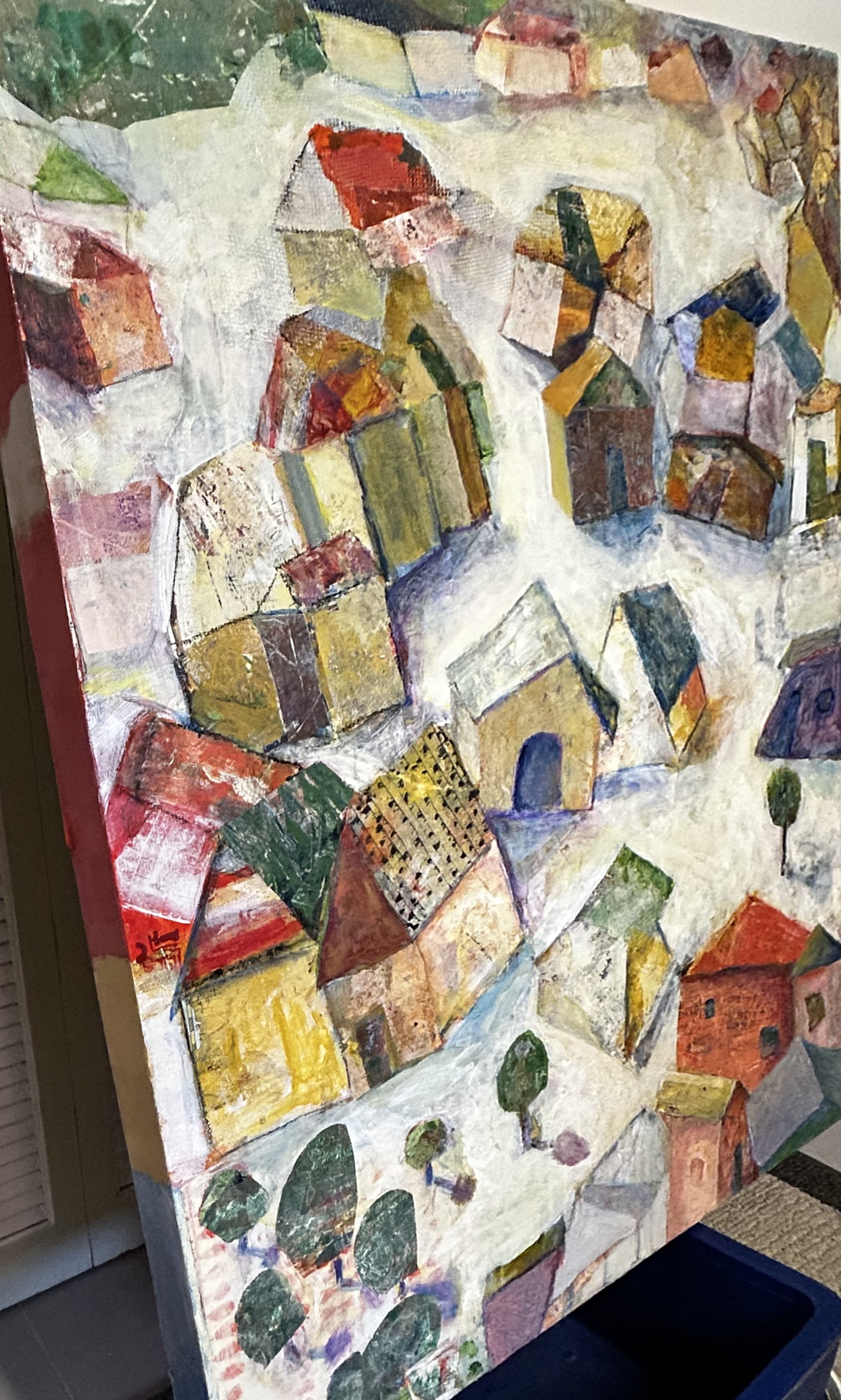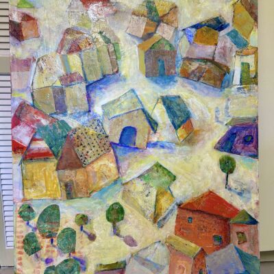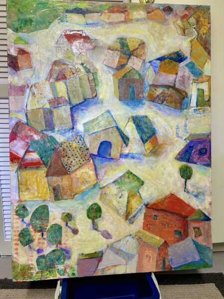 This mixed media painting of a village with an orchard is a vibrant, textured, work that blends elements of folk art with cubism. It appears to be viewed from above, with some houses tilting and others tightly knitted together. The trees are rendered in whimsical, block-like forms.