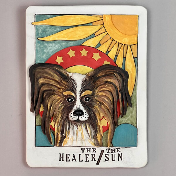 Wall hanging ceramic Bas relief sculpture with under glaze painting. Oversized Medicine Card features a healing spirit guide.