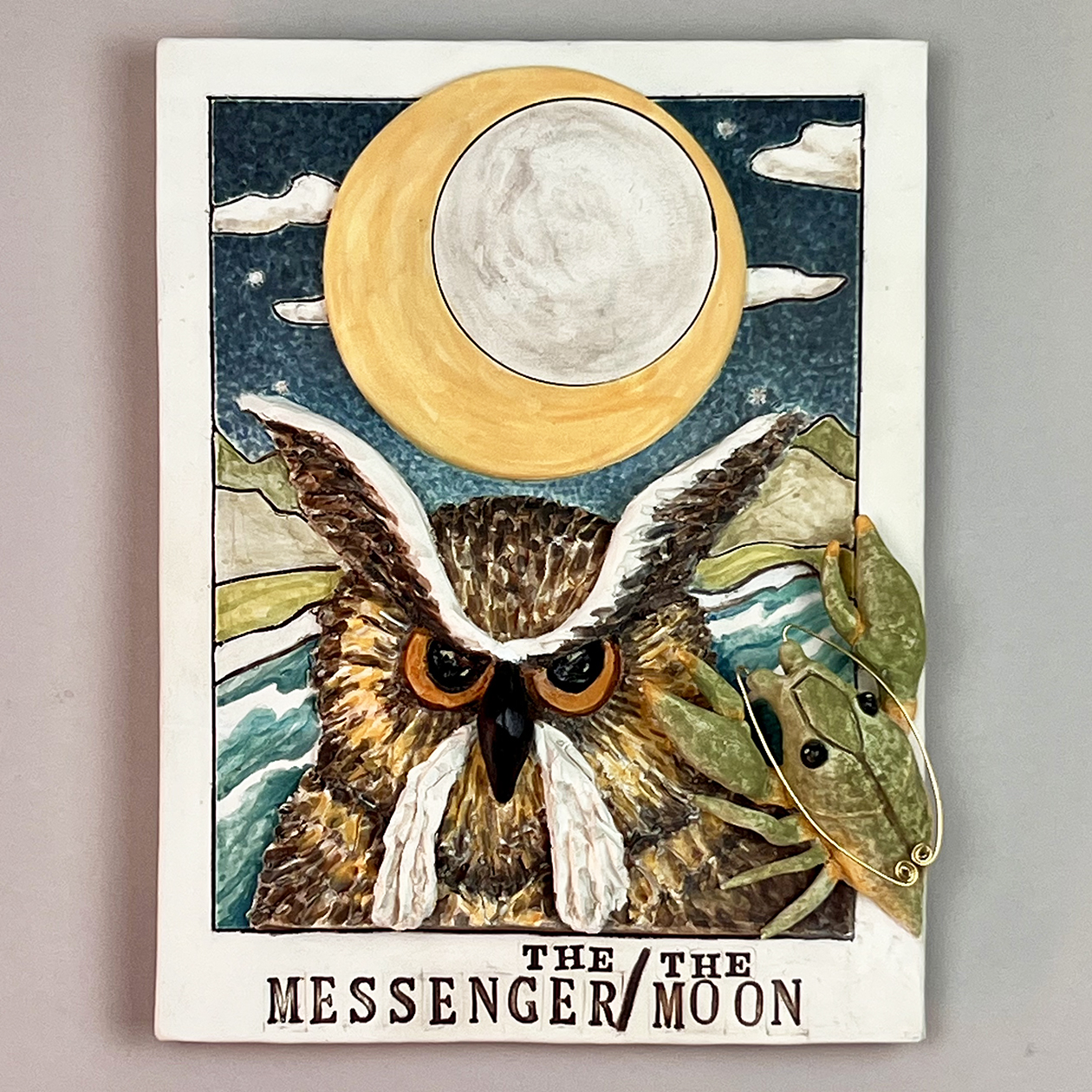 Wall hanging ceramic Bas Relief sculpture with under glaze painting and wire. Oversized Medicine Card features the magic of night with the pull of the moon.