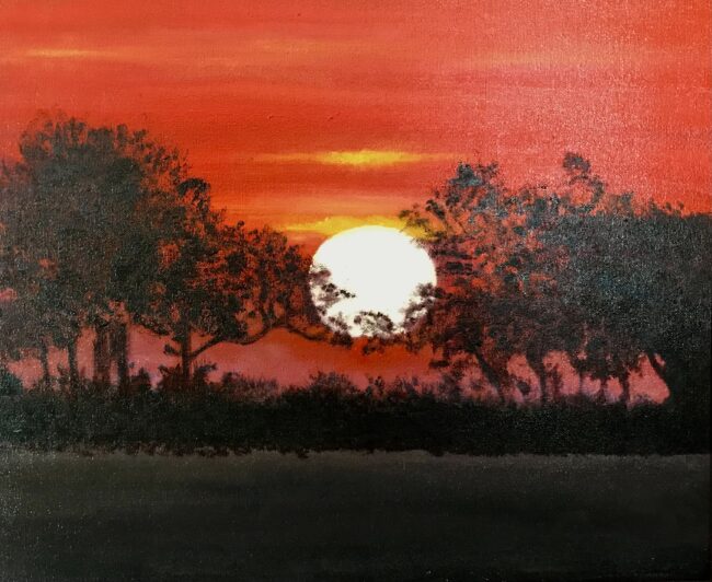 Tree of life was painted in Botswana against the deep orange and red sky as the sun was setting behind the acacia trees.