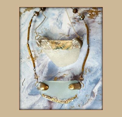 Sea glass, paua shell and abalone dust.