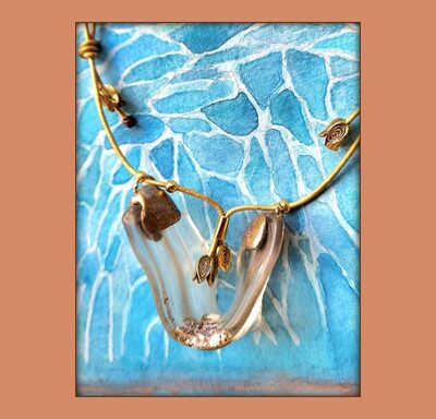 A most unusual seaglass specimen with metal floral findings and abalone dust.