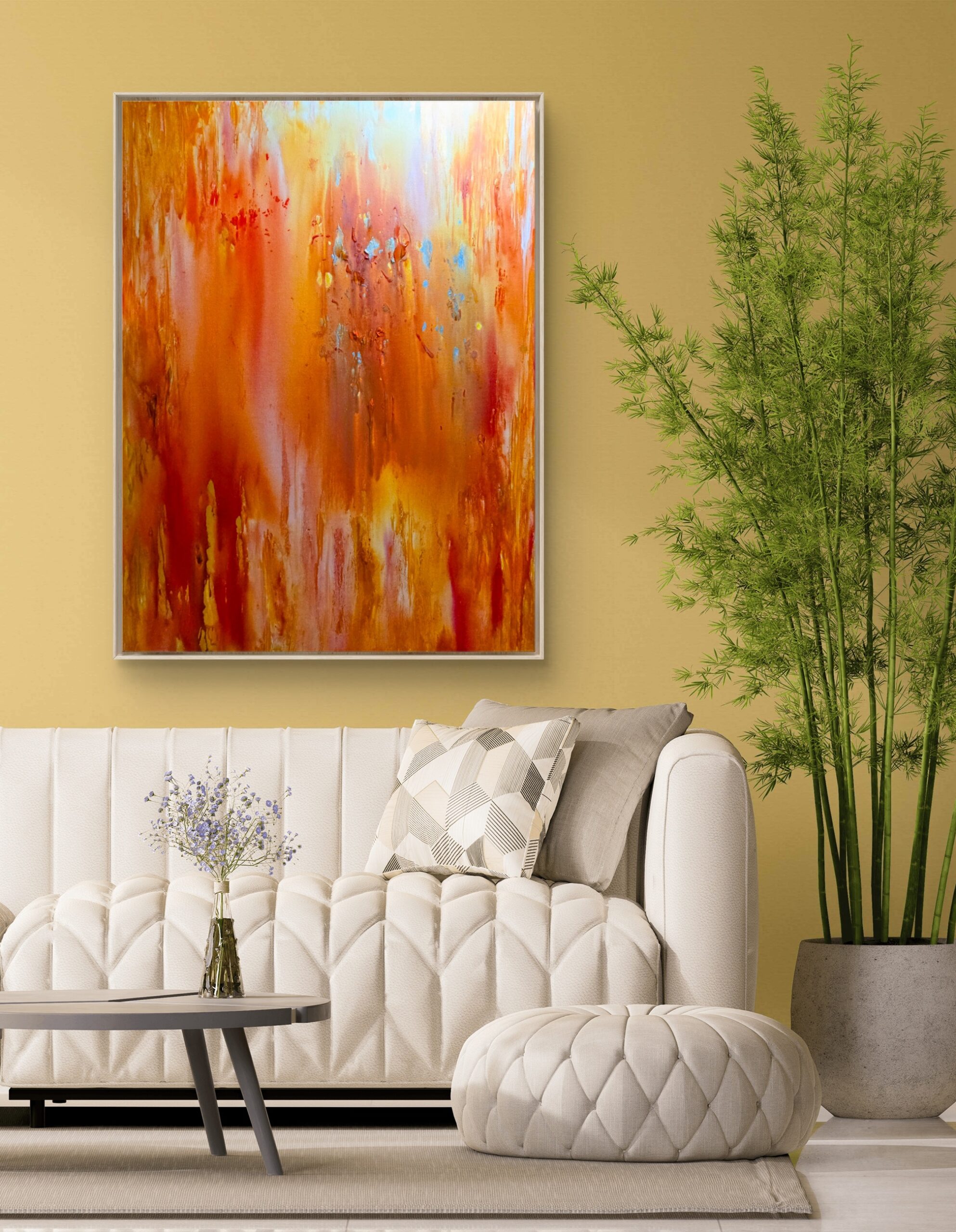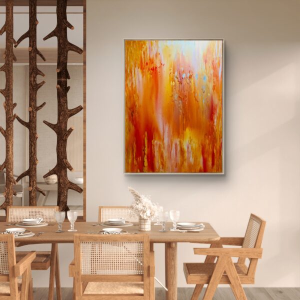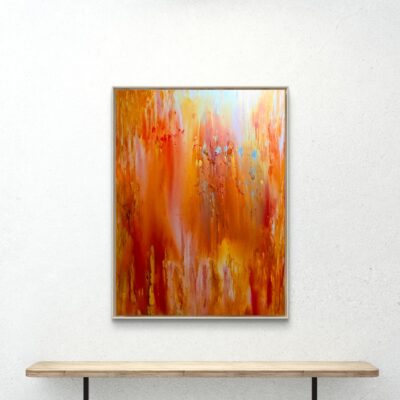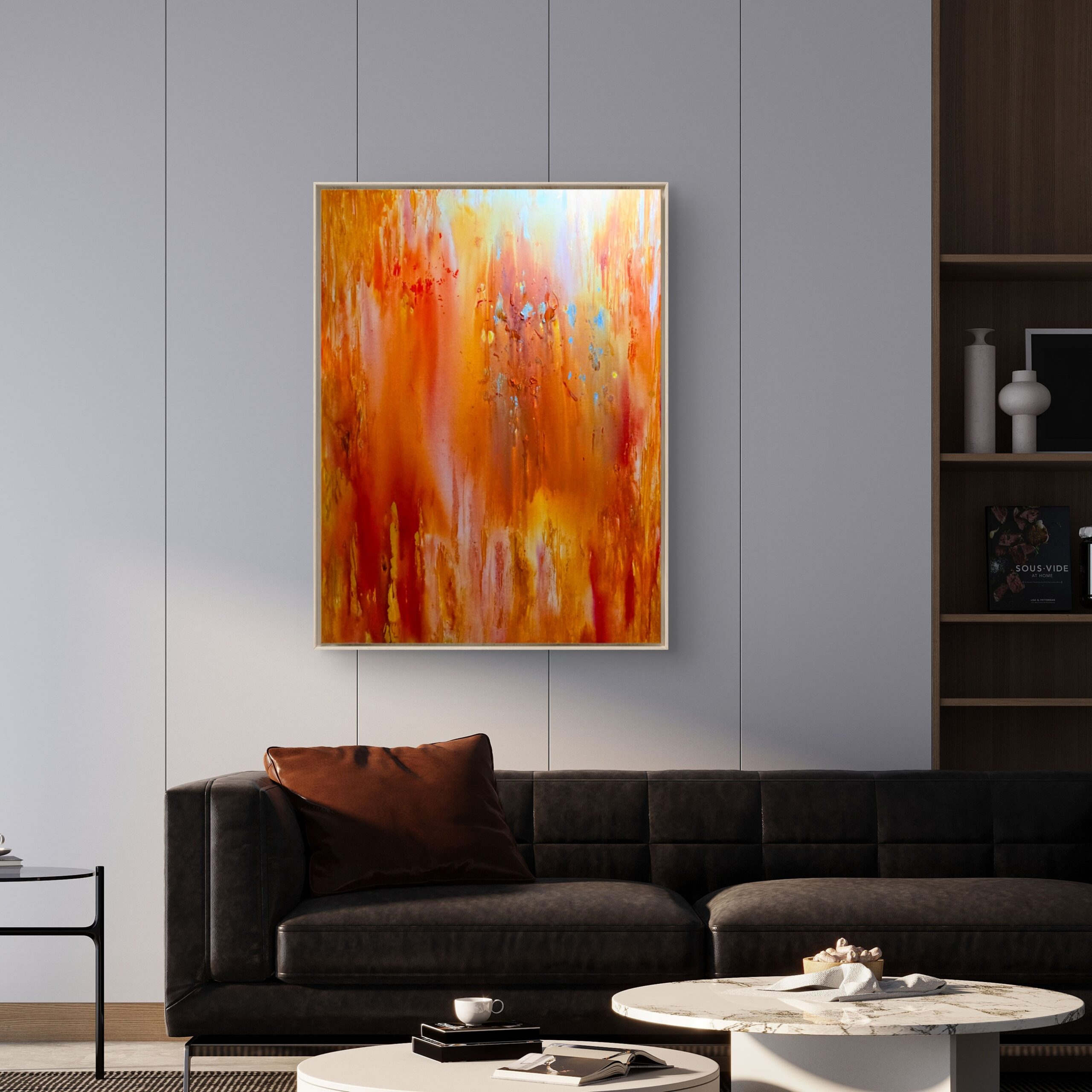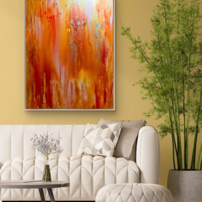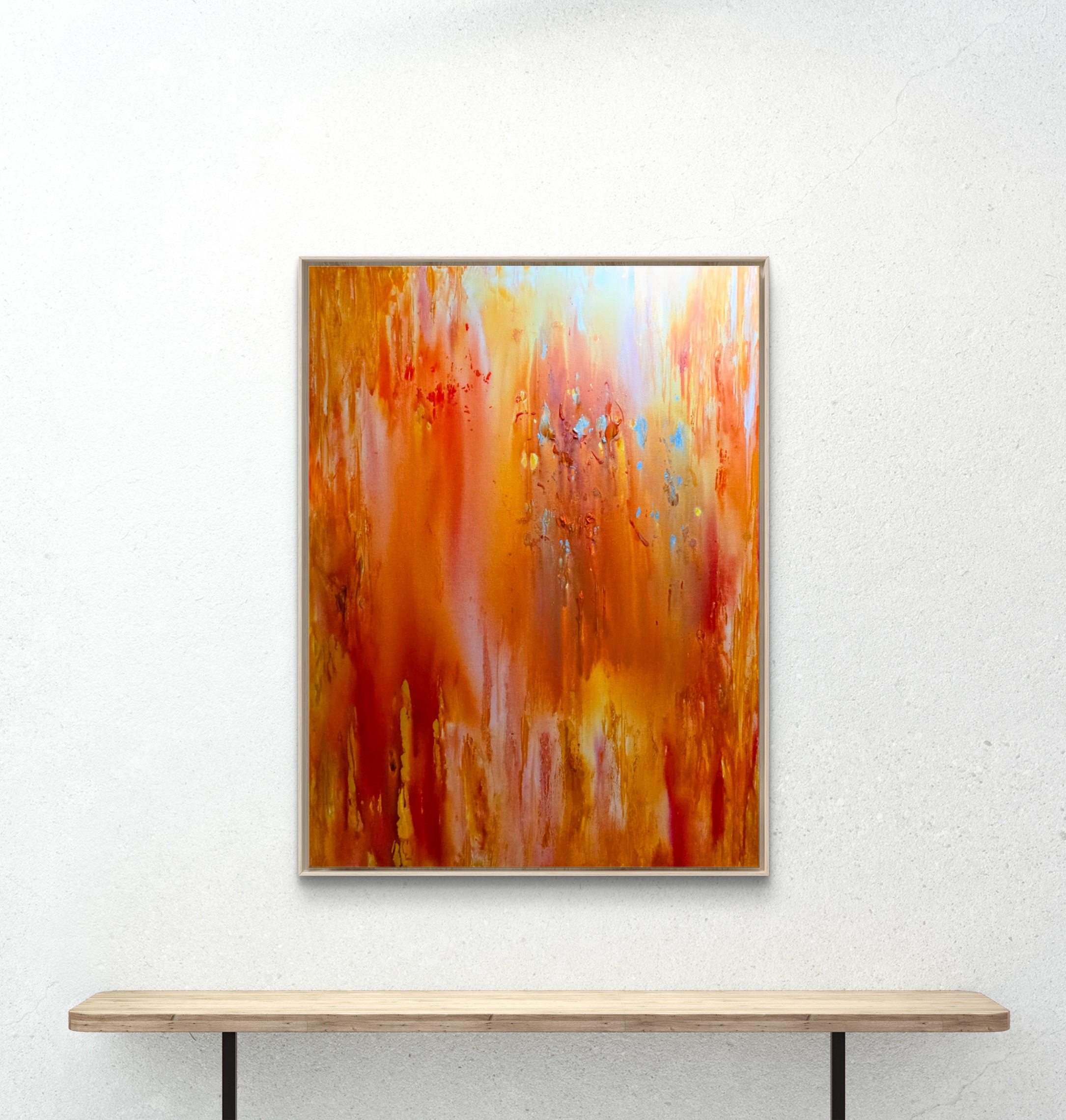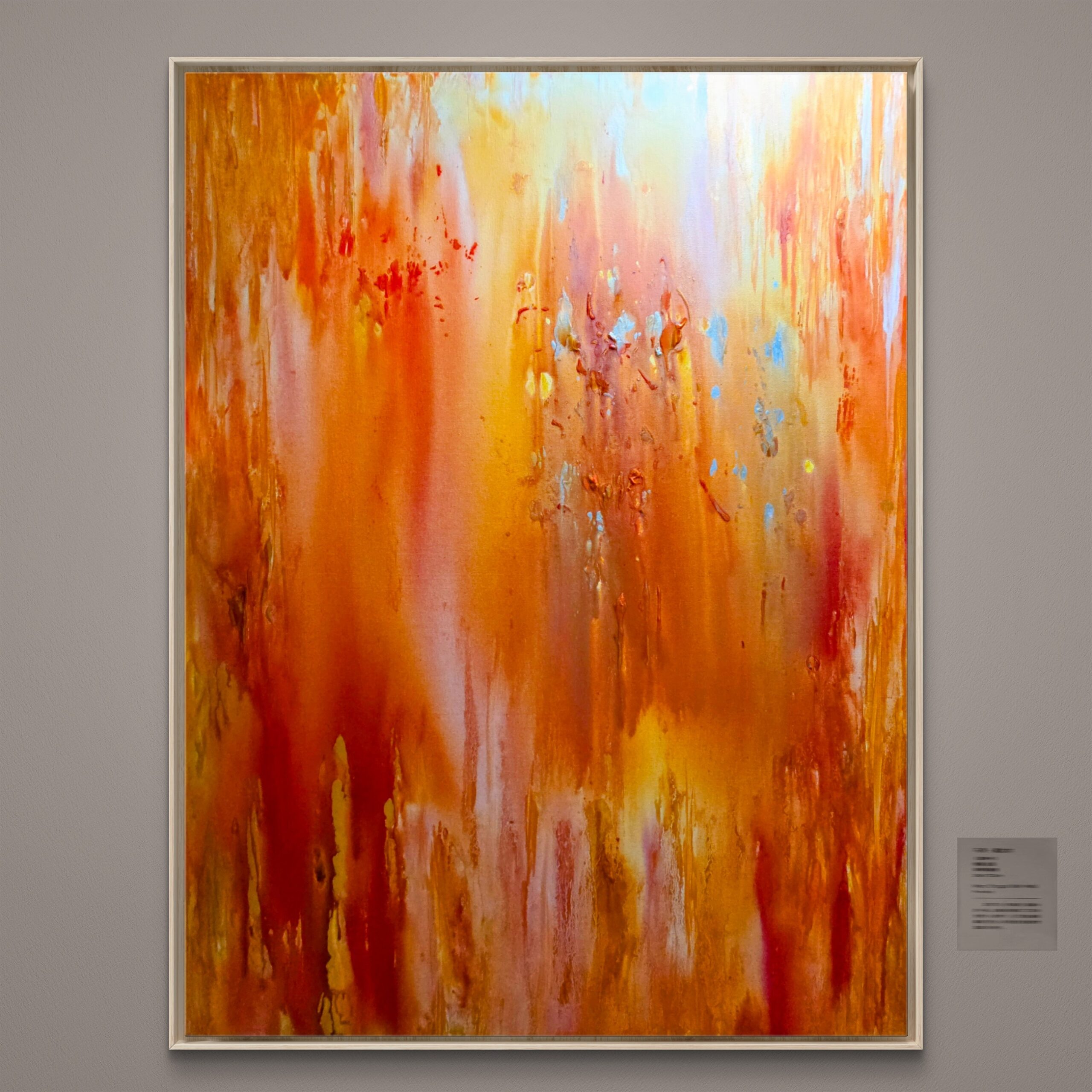 Soft cascades of color move and settle into one another, creating a sense of closeness and calm. Rather than bursting outward, the painting draws you inward, inviting you to sit with its glow. It speaks to the subtle ways emotion lingers, echoing gently beneath the surface, felt more than seen.